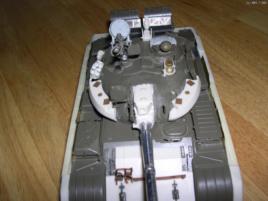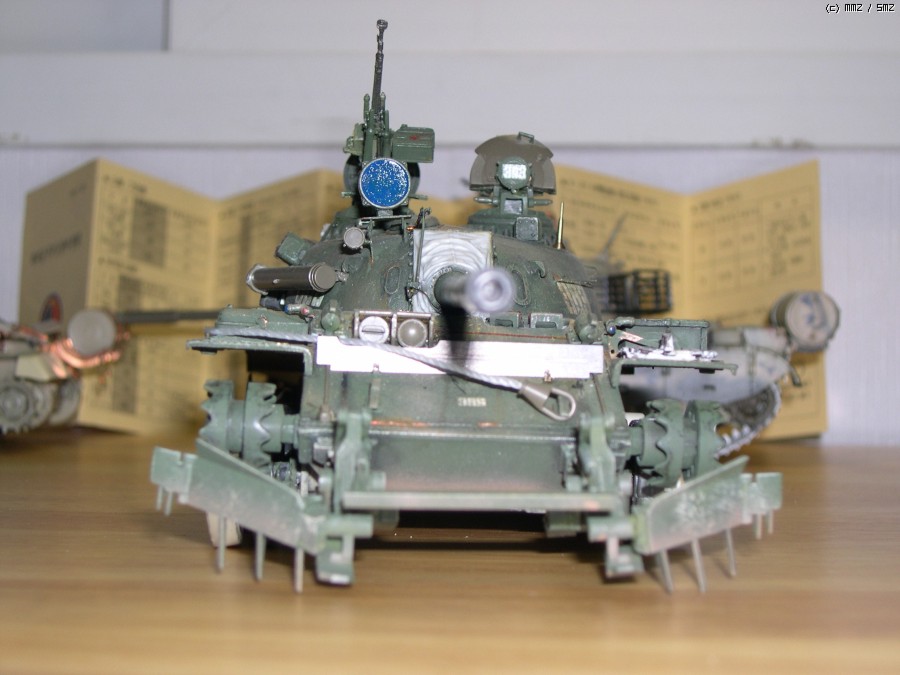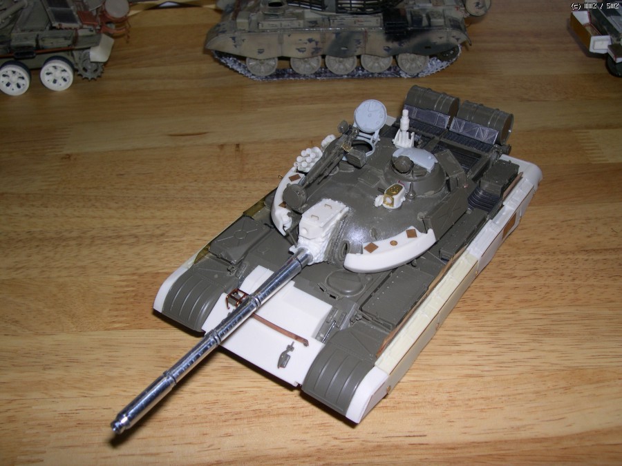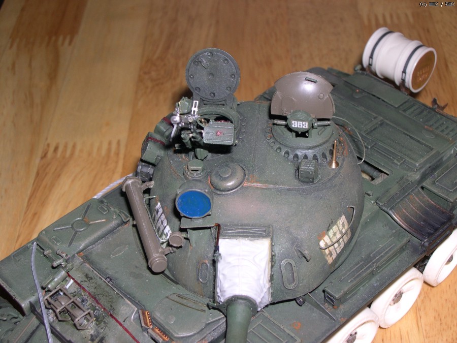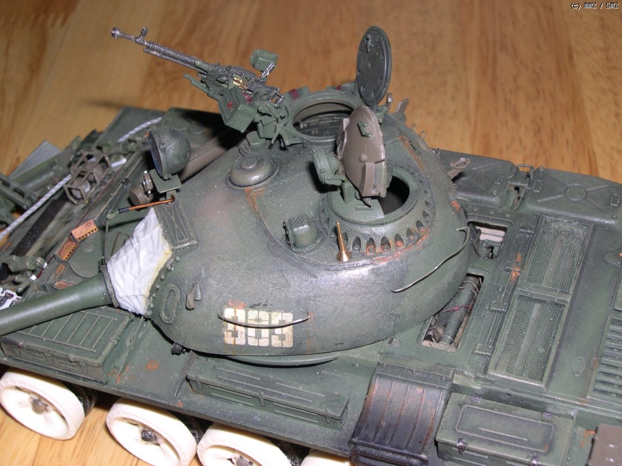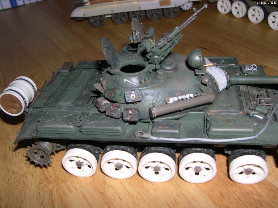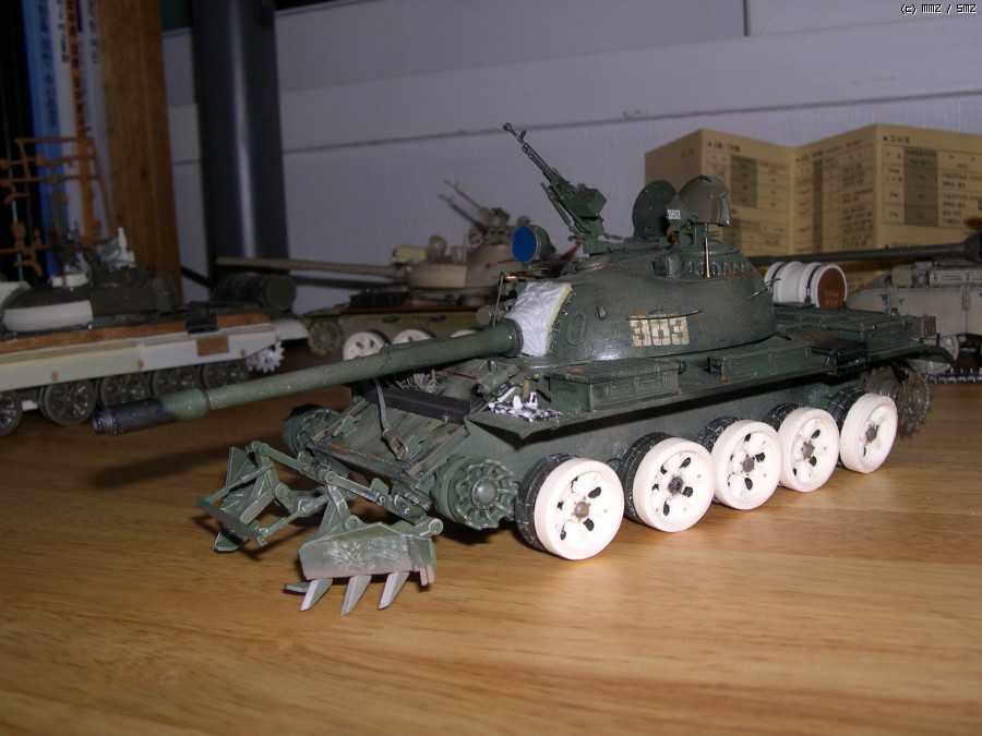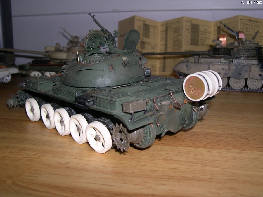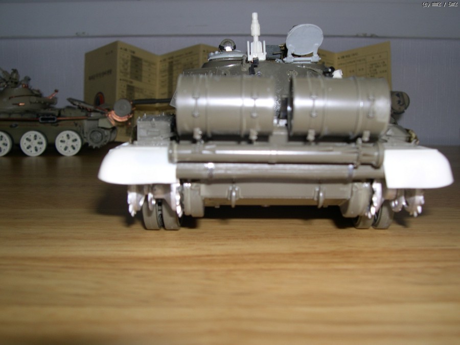 사진에서 보시면 아시겠지만 포탑에 말발굽같은 증가장갑과 전면장갑 보강, 바렐에 내열자켓, 사이드스커트, 포탑위에 레이저조준장치 및 측풍장치가 달린 T55의 개량모델입니다.