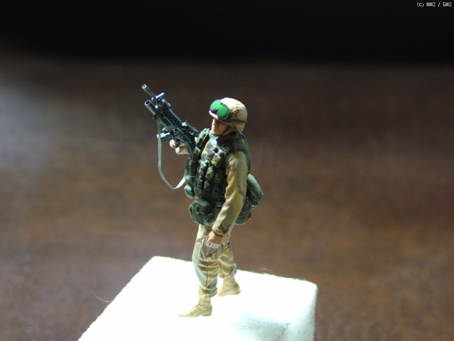 에폭시를 이용해 포켓정도만 추가 해주었고..헬멧을 MICH 2000과 비슷하게 만들기위하여 앞에 챙부분을 갈아내고 NVG 마운트를 프라판을 이용하여 만들어 주었으며..이라크 주둔미군이 없어서는 안될 고글을 자작해 주었습니다.