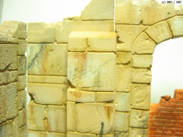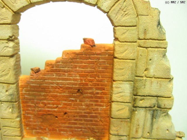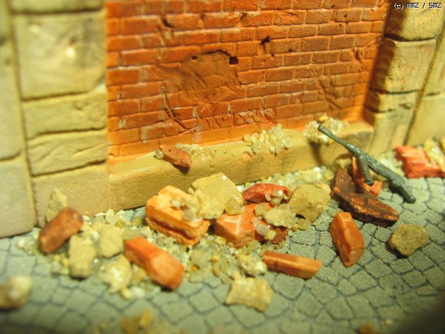 벽면이 부서진 잔재 표현. 석고로 여벌 복제를 만들어 벽돌 부분을 부수어 가면서 늘어 놓았습니다. 대리석 부분도 추가 복제를 이용하여 부순 후 색칠하여 배치했습니다. 아직은 좀 어색하네요... 초보의 한계라 할까..