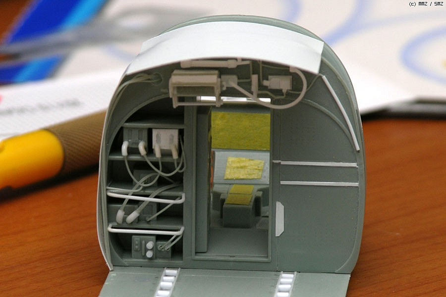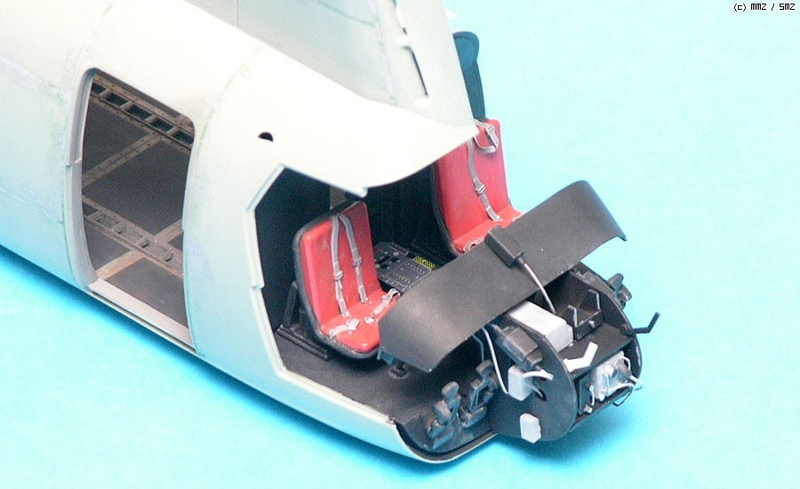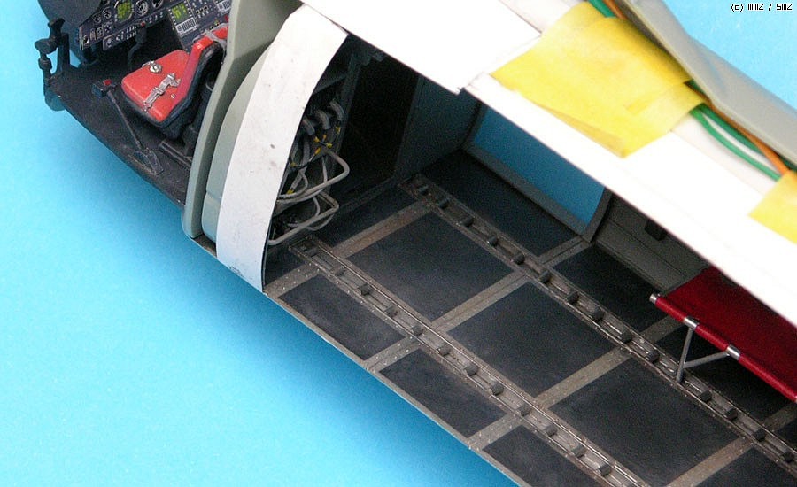 조종석 앞쪽은 원래 않보이지만 점검창을 열어놓은 형태로 만들기위해 사진자료를 바탕으로 비스무래하게 만들어 주었습니다. 역시 런너늘린것으로 전선표현을 해주었고 실내판넬은 0.5mm프라판으로, 그 안의 장비들도 프라판을 겹쳐서 만들어 주었습니다.