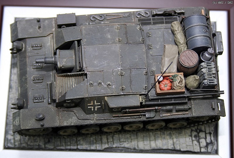 이른바... 독일군..소풍모형이 된 것같지만.. 그래도 칙칙한 전차에 포인트 하나 만들어 보고자.. 일본 모델러의 작품에 짐칸에 호박이 실린 작례를 본 기억이 있어 호박과 감자 주머니 당근 등을 발사 나무판으로 만든 상자안에 에폭시 퍼티로 만들어 넣어 주었습니다..