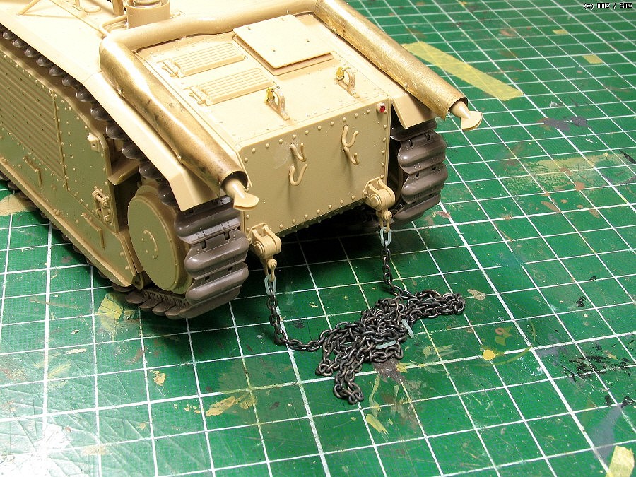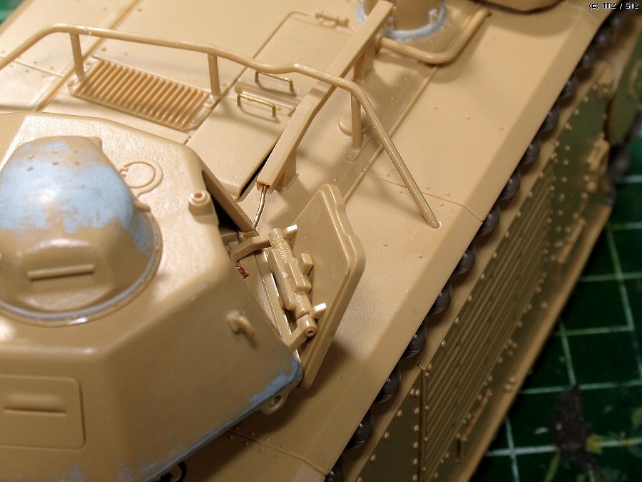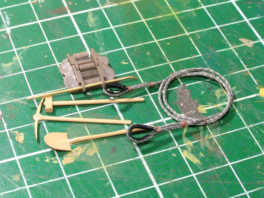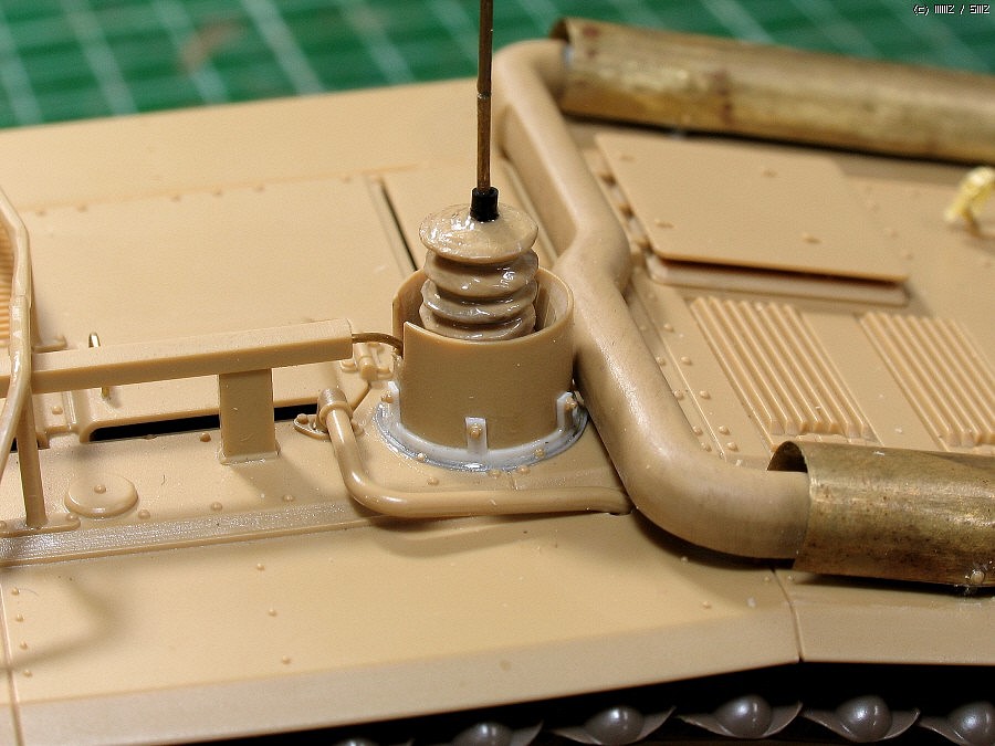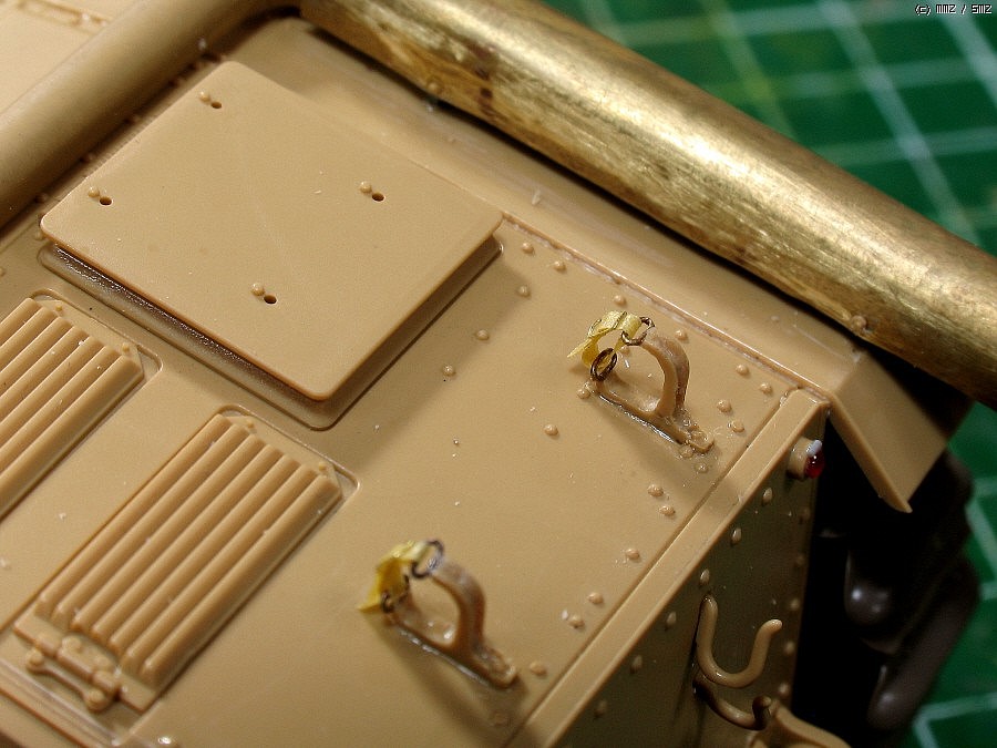 단순한 키트의 장비걸이는 실차와 비교해 다듬었습니다.고리는 비슷한 크기사슬한마디(다시보니 크네요)이고,중간의 홈은 나이프로 긁어서 파주고, 고정부에 볼트심고....
