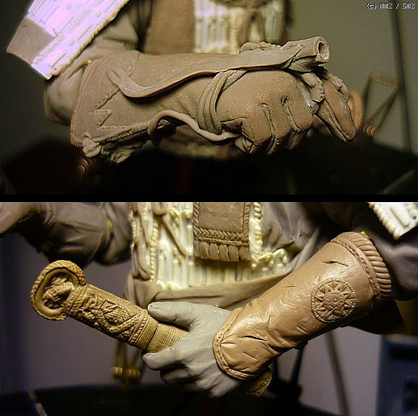 왼팔은 '쌍용문 환두대도'를 잡고 있는 것으로 만들었는데, 지금은 손잡이만 있지만 최종완성에서는 칼집과 패용띠도 함께 구성이 될 것입니다.