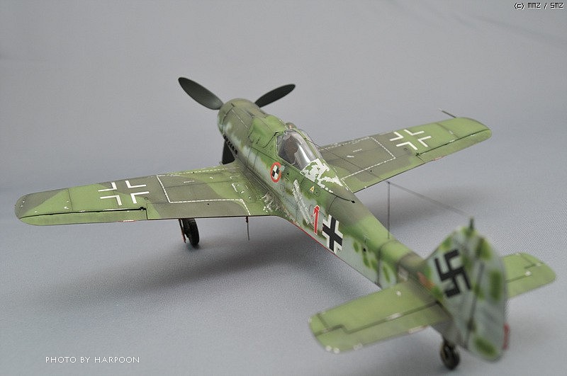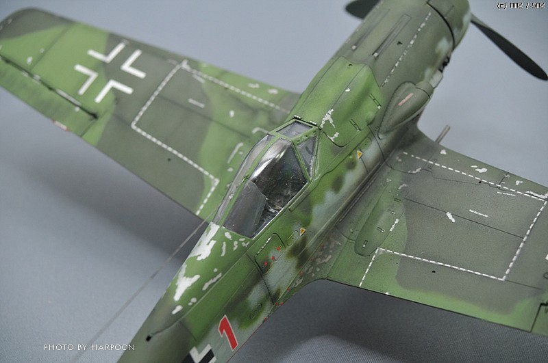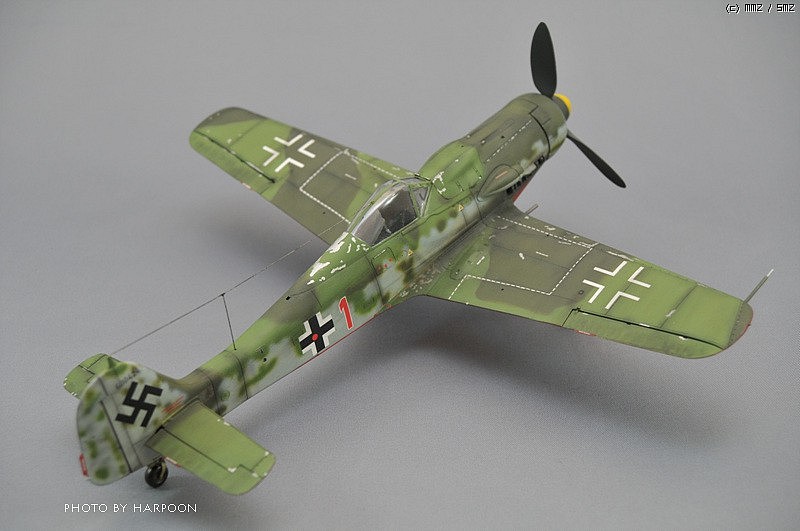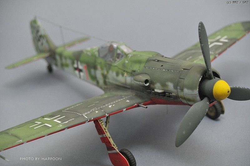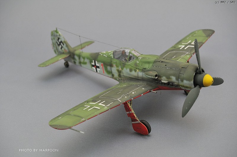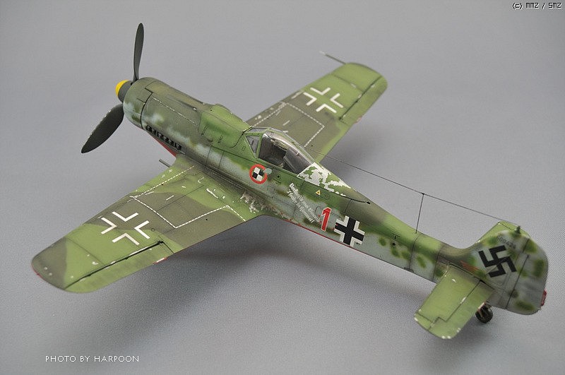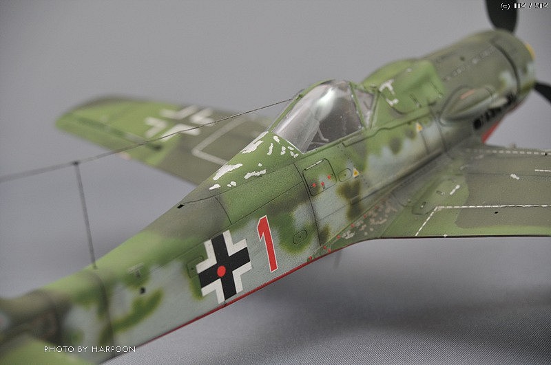 타미야 1/48 Fw190 D-9 JV44입니다. 여러해 만들다가 방치한 녀석인데 최근에 마무리 했습니다. 추가적인 디테일업은 시트에 벨트추가와 날개쪽 기총에 황동관으로 교체한 것이 전부입니다. 조립후 서페이서 올리고 도색은 설명서에 포함된 도색가이드에 지정색 그대로 도색을 했습니다. 서페이서 칠위에 라인을 따라서 검은색 밑도장을 하구요 지정색을 그위에 도색했습니다. 상면은 그라디에션 도색을 했구요. 하면은 흰색을 먼저 칠하고 그위에 마스킹해서 스트라이프 무늬를 만들었습니다. 간격은 눈대중으로 했구요 스트라이프의 크기도 들쭉날쭉합니다. 그냥 보기 좋게 한다는 생각으로 작업을 했습니다. 웨더링은 상면은 파스텔만 이용해서 했구요, 배면은 먹선넣기와 웨더링을 이용해서 웨더링을 했습니다. 마감은 모델마스터의 무광클리어를 입혔구요. 안테나선은 런너 늘인것을 이용했습니다. 끝으로 킷을 제공해주신 박규택님께 감사드립니다. 보내주신지 오래되었는데 너무 오랫동안 데칼을 방치해서 그런지 나중에 붙이는데 혼났습니다. 가급적 데칼은 지퍼백에 보관하는게 좋을것 같습니다. 회원 여러분 즐거운 모형생활 하세요.