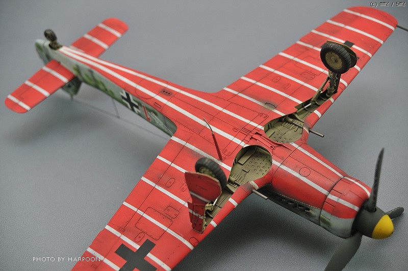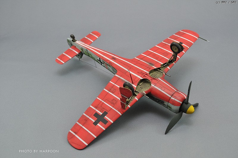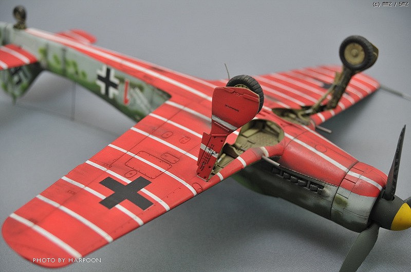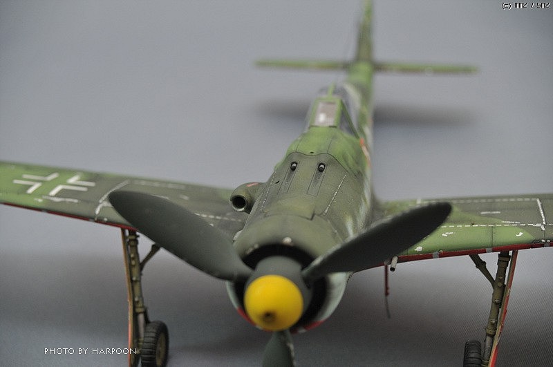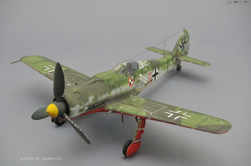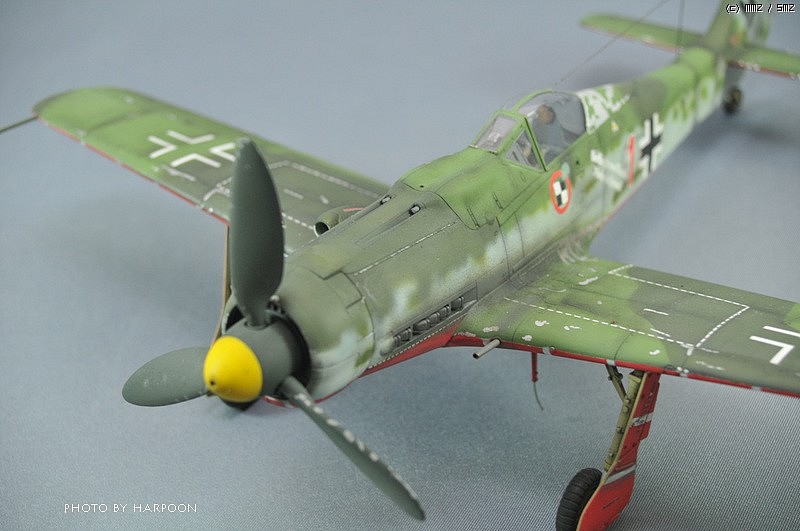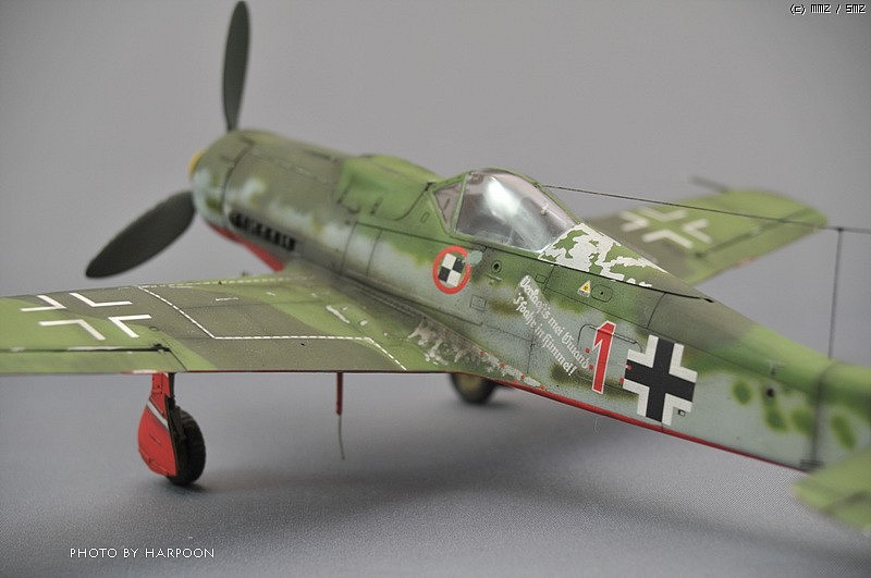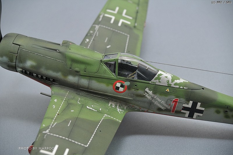 타미야 1/48 Fw190 D-9 JV44입니다. 여러해 만들다가 방치한 녀석인데 최근에 마무리 했습니다. 추가적인 디테일업은 시트에 벨트추가와 날개쪽 기총에 황동관으로 교체한 것이 전부입니다. 조립후 서페이서 올리고 도색은 설명서에 포함된 도색가이드에 지정색 그대로 도색을 했습니다. 서페이서 칠위에 라인을 따라서 검은색 밑도장을 하구요 지정색을 그위에 도색했습니다. 상면은 그라디에션 도색을 했구요. 하면은 흰색을 먼저 칠하고 그위에 마스킹해서 스트라이프 무늬를 만들었습니다. 간격은 눈대중으로 했구요 스트라이프의 크기도 들쭉날쭉합니다. 그냥 보기 좋게 한다는 생각으로 작업을 했습니다. 웨더링은 상면은 파스텔만 이용해서 했구요, 배면은 먹선넣기와 웨더링을 이용해서 웨더링을 했습니다. 마감은 모델마스터의 무광클리어를 입혔구요. 안테나선은 런너 늘인것을 이용했습니다. 끝으로 킷을 제공해주신 박규택님께 감사드립니다. 보내주신지 오래되었는데 너무 오랫동안 데칼을 방치해서 그런지 나중에 붙이는데 혼났습니다. 가급적 데칼은 지퍼백에 보관하는게 좋을것 같습니다. 회원 여러분 즐거운 모형생활 하세요.