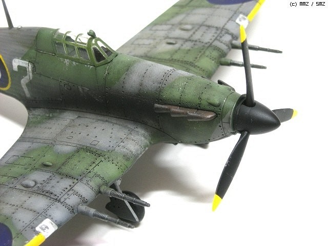 일반적으로 알고 있는 호커 허리케인의 위장색 (갈색/녹색) 과 달라 순간적으로 도색 의욕이 사출 장치타고 탈출(?)하는 고비가 있었지만 리벳 찍으면서 손에도 찍은 것이 아쉬워 본전이라도 뽑자는 마음으로 칠했습니다.