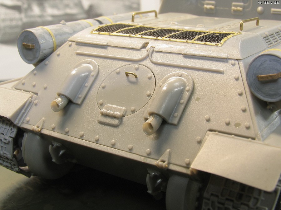 T-34계열의 숙명적 디테일업인 엔진 그릴. 마스킹테잎을 사용해 보았는데 나름 좋은 결과가 나왔습니다.