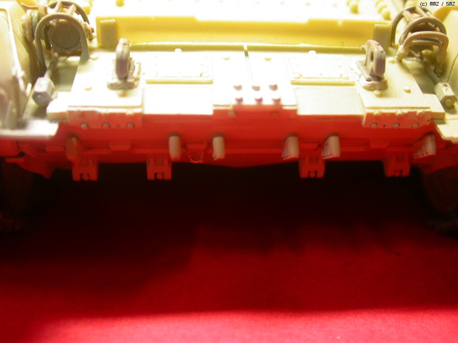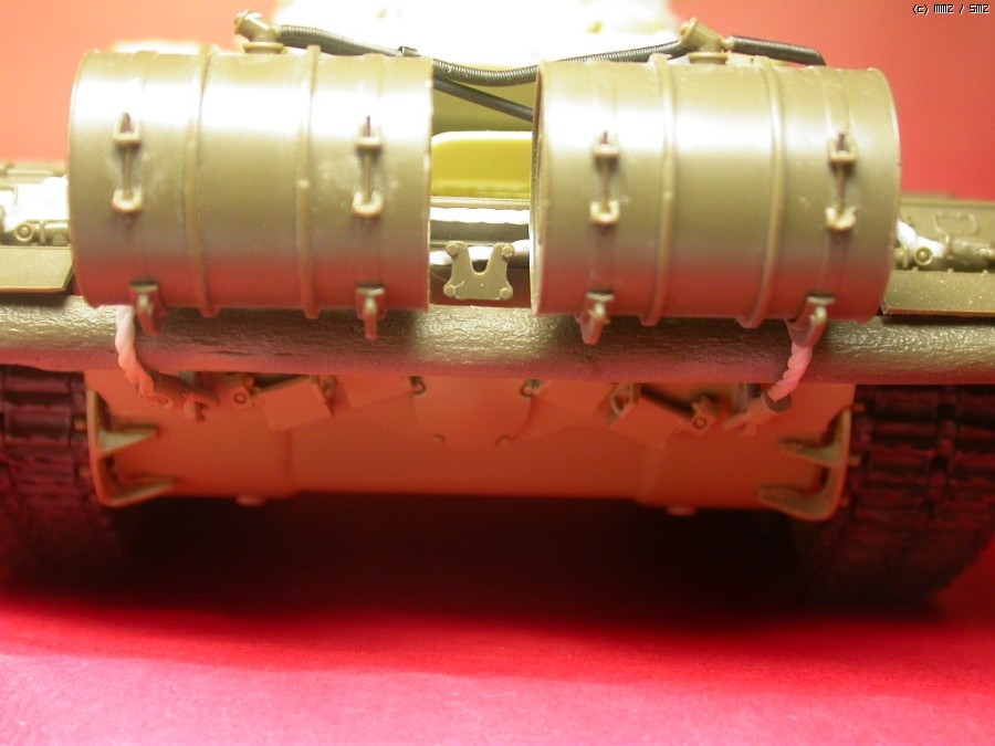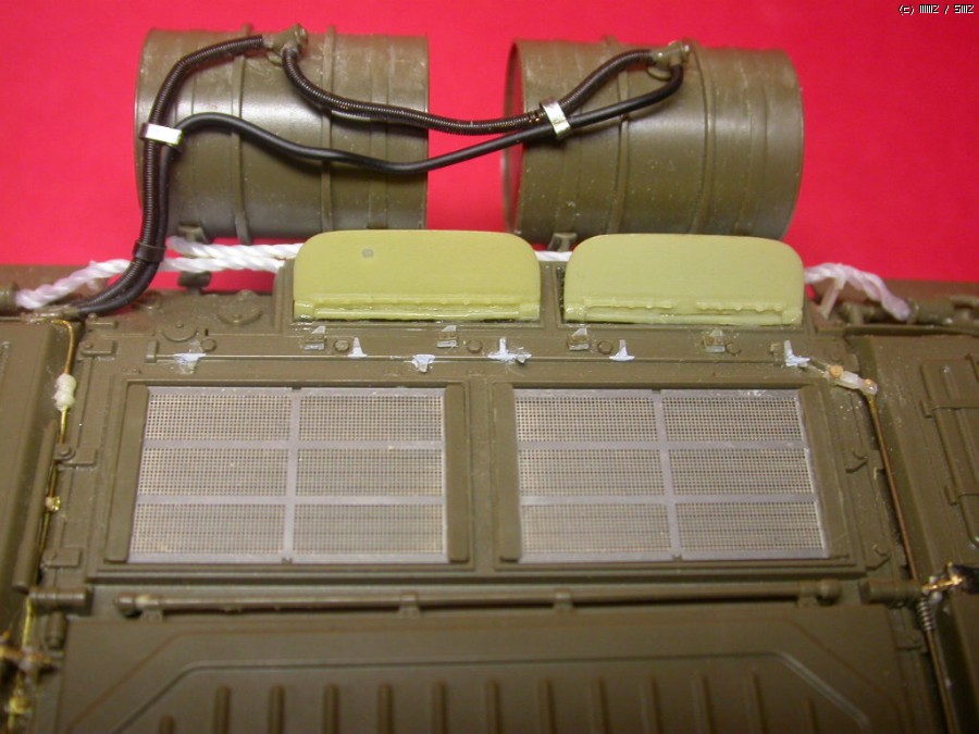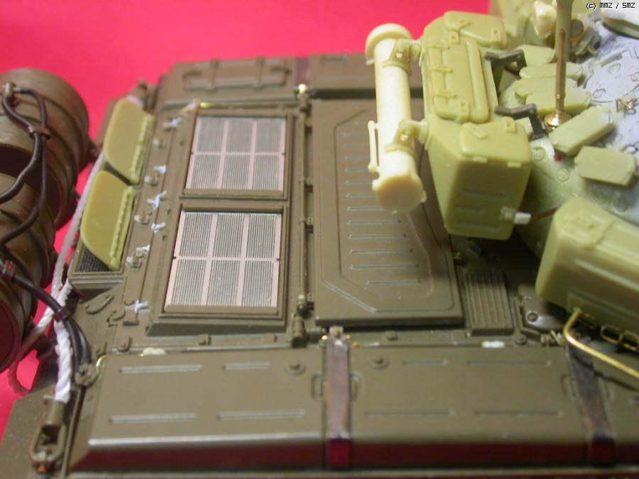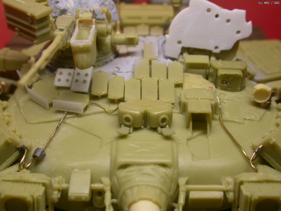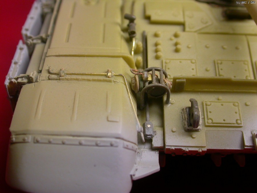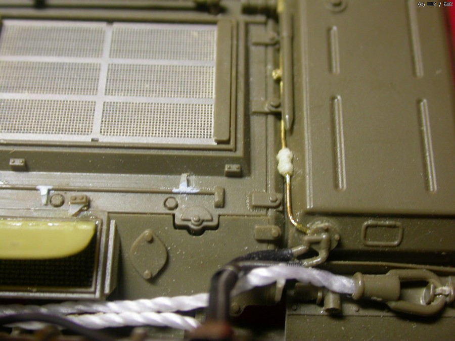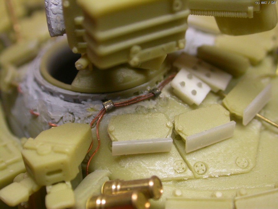 해외에도 몇작품 T-90 작례가 있읍니다만..전방 쇼트라시스템과의 배선부위나 일부 터렛에서 빠져나오는 배선이 T-90의 시기상의 문제(또는 구체적 형식)인지, 자료부족때문인지는 모르겠으나 그 결선방식의 재현이 모델러마다 약간씩 차이가 있으며 자료사진들도 또한 좀 다양한 배선형태가 있읍니다..