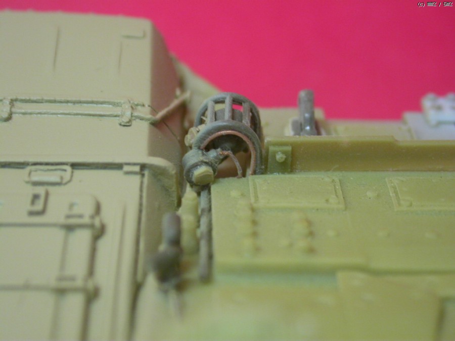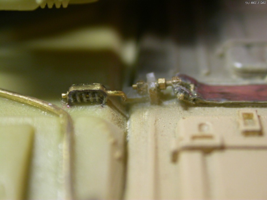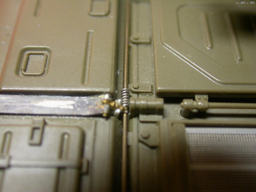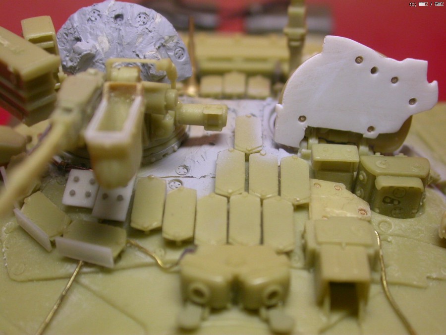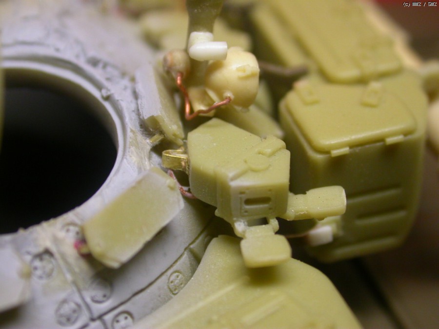 터렛 상면부의 경우..후방부로 갈수록 곡면율이 커지므로 .그 위에 부착시키는 Kontakt의 경우 앞쪽 일부는 Miniarm부품을 그냥 사용부착하였으나(높이가 어느정도 잘 맞는 편입니다), 양 큐폴라 주위와 후방부위의 경우는 그냥 붙이면 다 떠버리므로, Kontackt 지지대를 황동파이프로 교체해서 터렛표면에 박고 그 위에 붙여주었읍니다.(원 실물의 Kontackt 부착시 이방식으로 되어 있읍니다.)