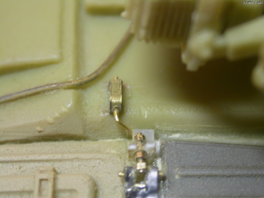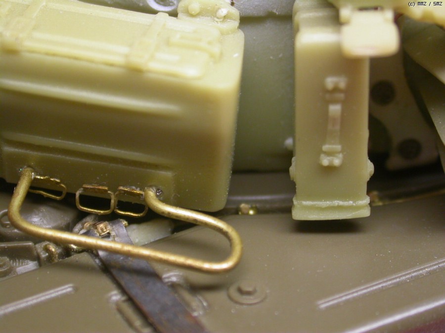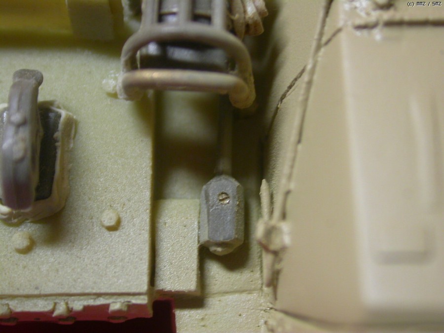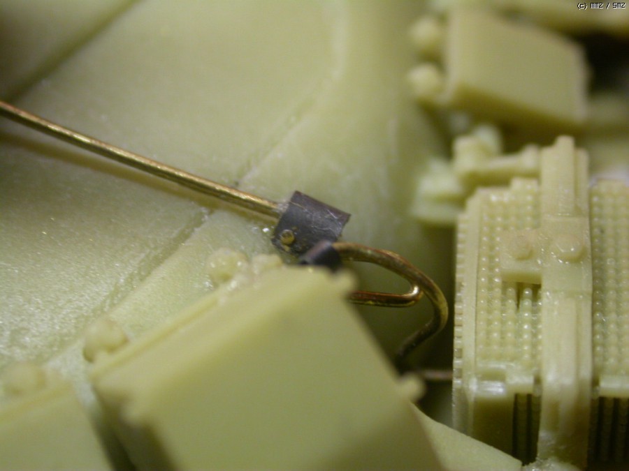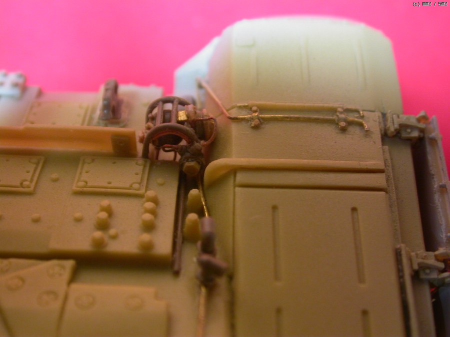 터렛 상면부의 경우..후방부로 갈수록 곡면율이 커지므로 .그 위에 부착시키는 Kontakt의 경우 앞쪽 일부는 Miniarm부품을 그냥 사용부착하였으나(높이가 어느정도 잘 맞는 편입니다), 양 큐폴라 주위와 후방부위의 경우는 그냥 붙이면 다 떠버리므로, Kontackt 지지대를 황동파이프로 교체해서 터렛표면에 박고 그 위에 붙여주었읍니다.(원 실물의 Kontackt 부착시 이방식으로 되어 있읍니다.)