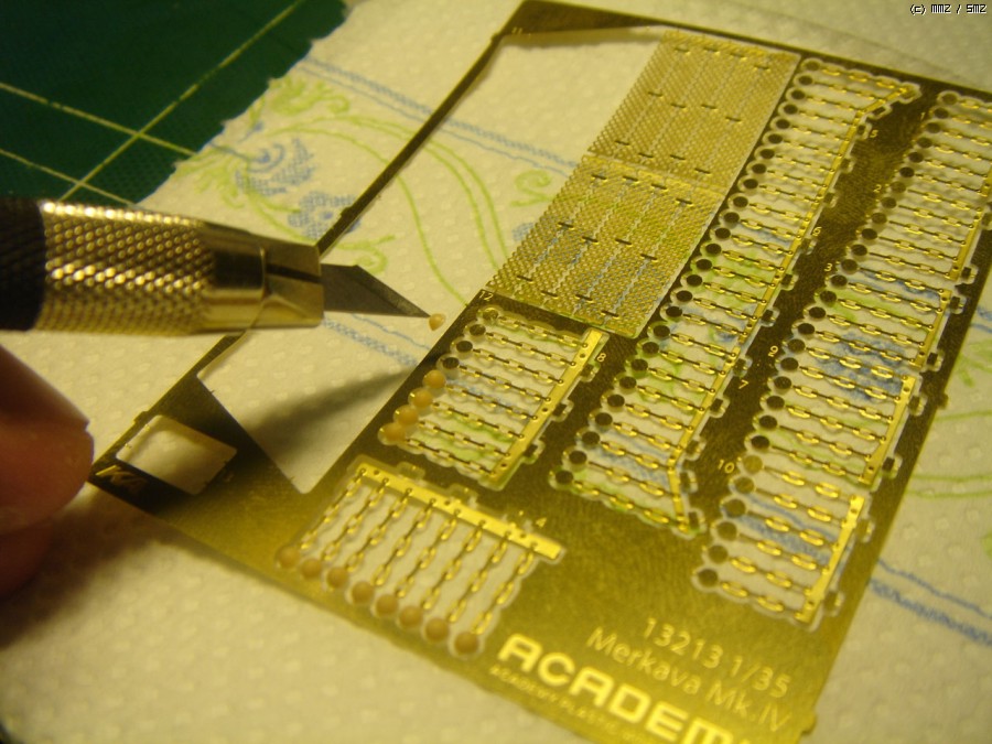 디자인나이프로 런너D에 있는 볼을 콕 찝어서 미리 짜놓은 순간접착제에 살짝 뭍인 후 바로 에칭부품에 붙여버리는겁니다. 물론 에칭을 떼어내기 전의 과정이구요. 아래에는 주방용 키친타올을 깔아두면 간혹 순간접착제가 많이 묻었을 때에도 흡수해버리니까 깨끗하게 작업이 될 수 있더군요.