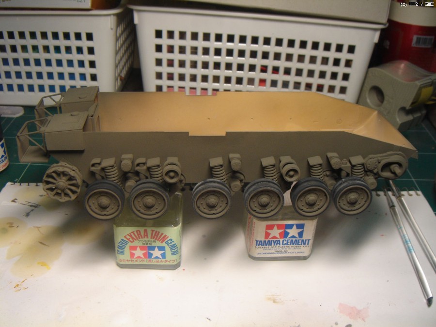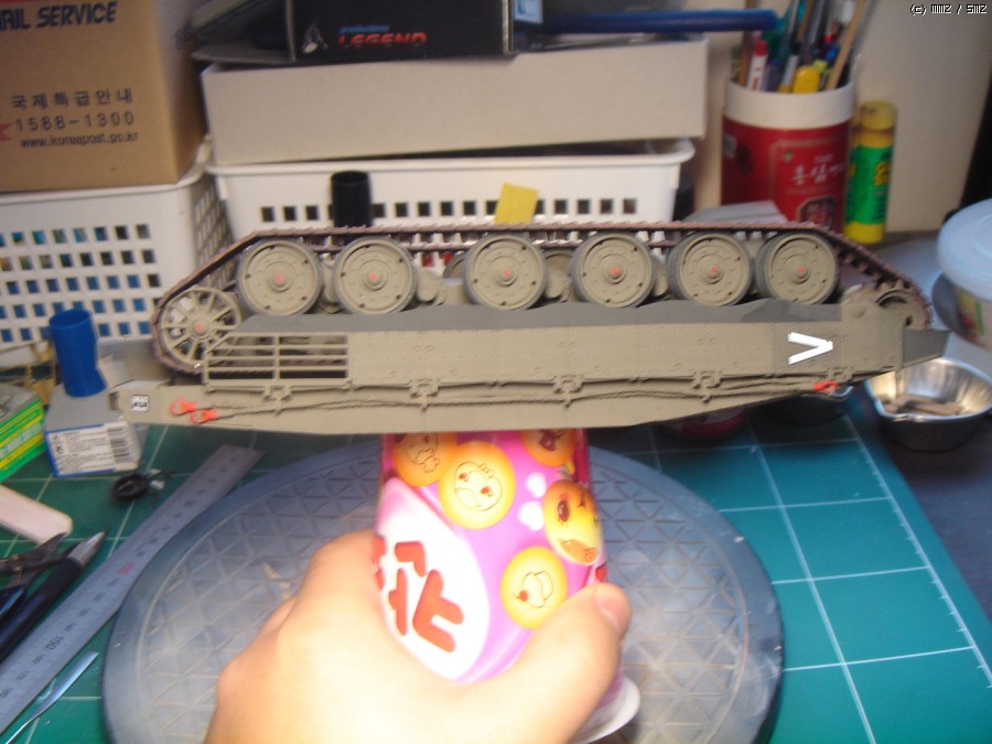 아카데미의 세미커넥팅 트랙은 조립전에 이렇게 미리 칠을 해두었습니다. 색상은 타미야 아크릴 헐레드+메탈릭그레이+티타늄을 적절히 섞은 조색으로 한쪽당 두개의 큰 덩어리로 나누어 한쪽은 스프로켓을 감싸고 있고 나머지 부품이 분리된 채로 도장하여 차체하부의 기본도장이 끝난 뒤 도장된 로드휠과 함께 단단히 붙여주고 상판을 접착하였습니다.