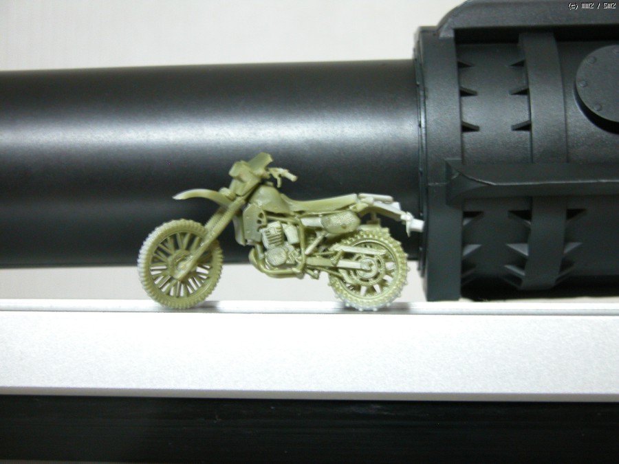 처음 설명서를 보면 하체부터 제작하게 되어있습니다만, 포신이 먼저보고싶어 포신부터 만들었습니다. 그러나 그 크기는 음..1/35 바이크와 비교한 사진 입니다.