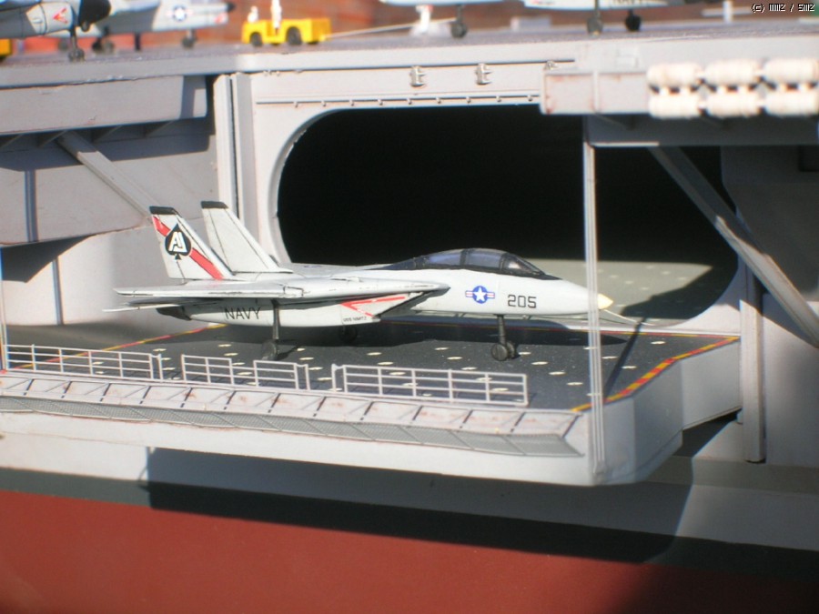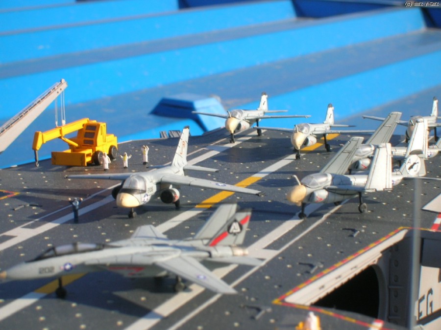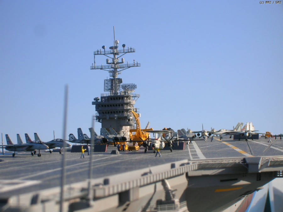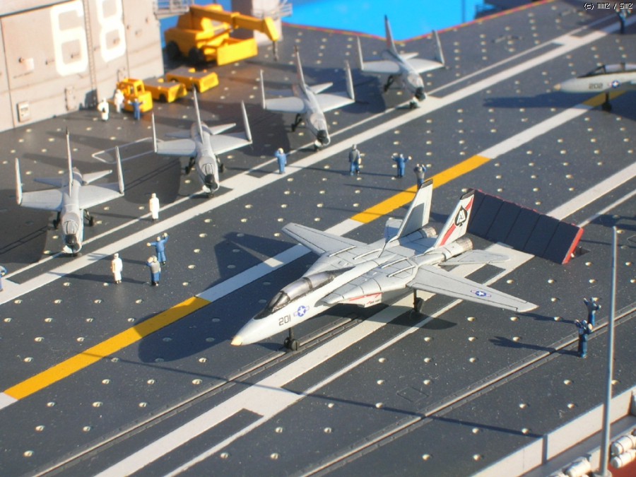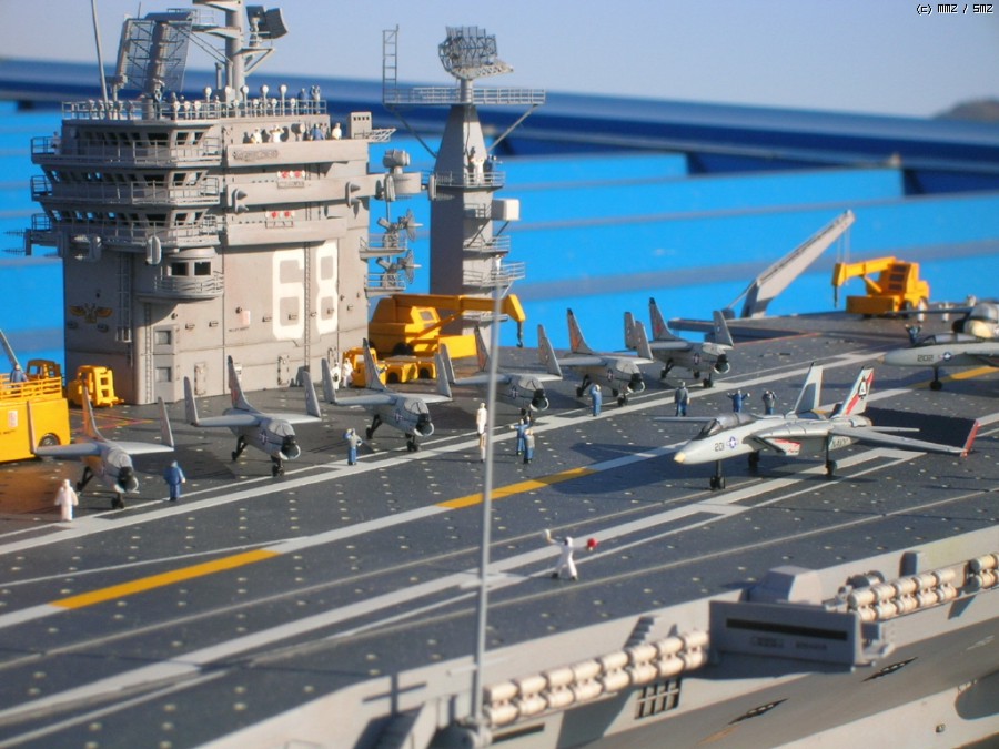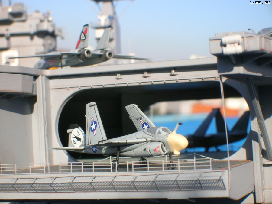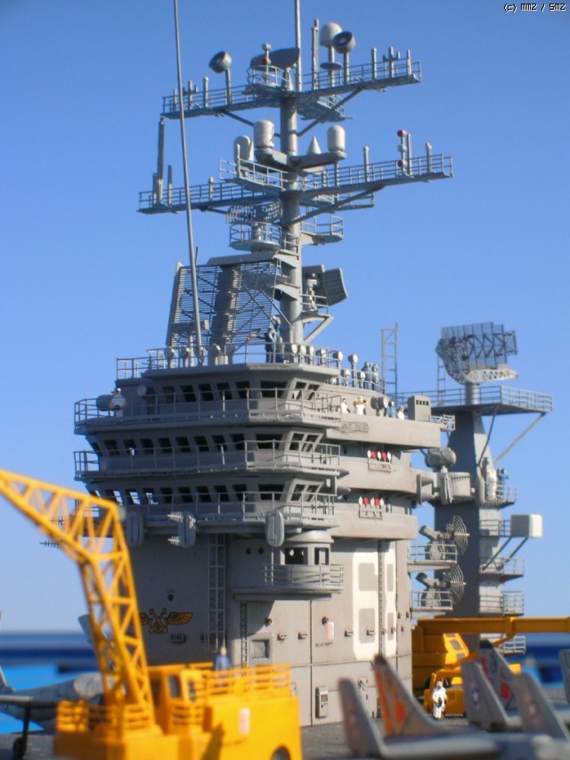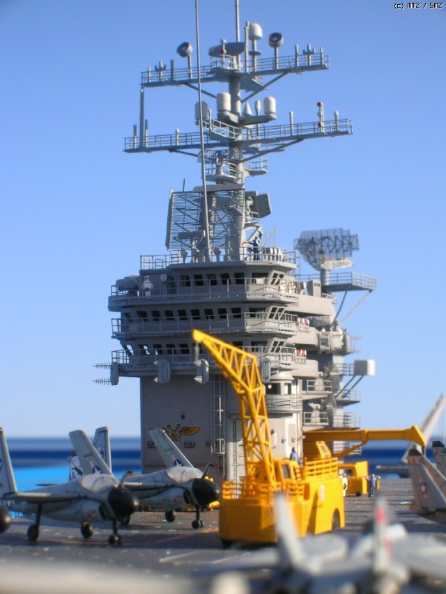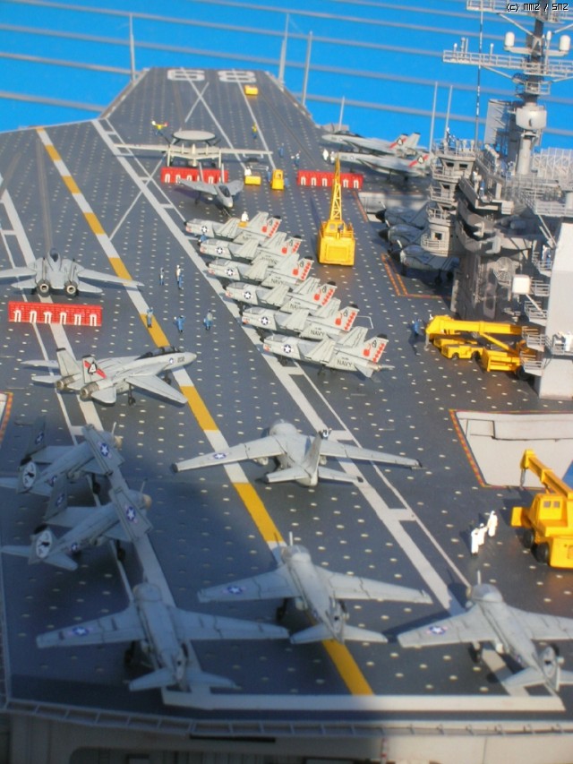 키트 자체는 널리(?) 알려진 몇개의 트러블 부위만 제외하면 그럭저럭 잘 맞는 편이고, 전체적인 느낌도 좋습니다. 항모 본체(선체)는 구조물이 간단한 현용항모 답게 약 20일만에 완성했는데, 키트를 제가 떠안은 후(...) 웨더링좀 더하면서 약간 개수해 90년대 초반 사양으로 만들었습니다. - 정확하다고는 할 수 없는(...) - F-14와 A-7, A-6등이 같이 취역중이던 시기가 이 시대밖에 없더군요;;;