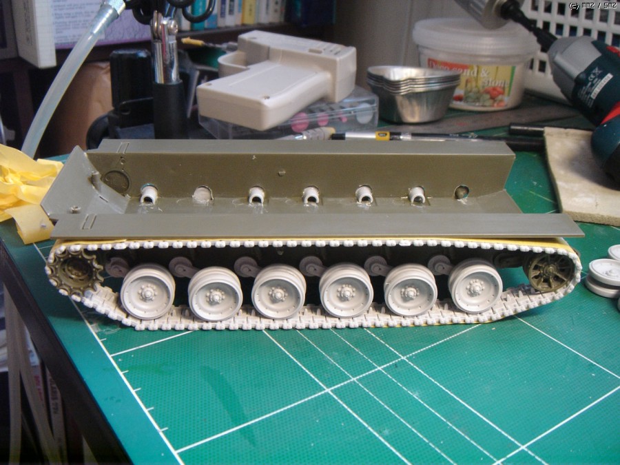 사이드스커트가 있는 차량이 대부분 그렇듯 차후 작업을 위해 먼저 로드휠과 트랙을 조립하고 색칠한 뒤 상/하판을 접착하게 될 예정입니다.