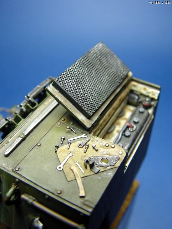 탱크의 앤진룸이 있는데 열어놓는것이 이쁜지라 열어버리고 볼트와 공구 약간의 부품들은 납판으로 자작한것입니다...