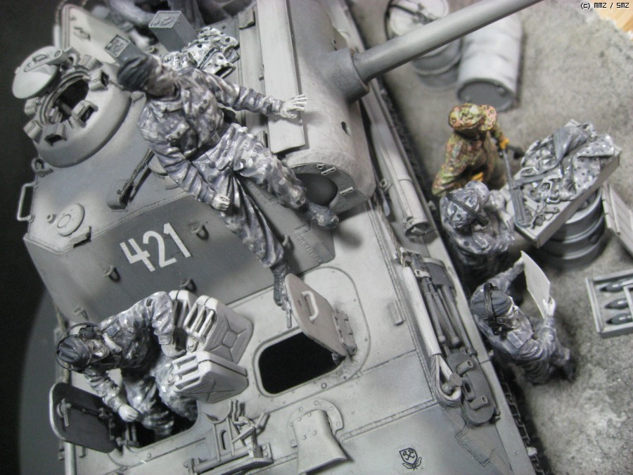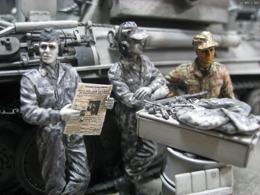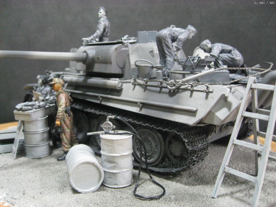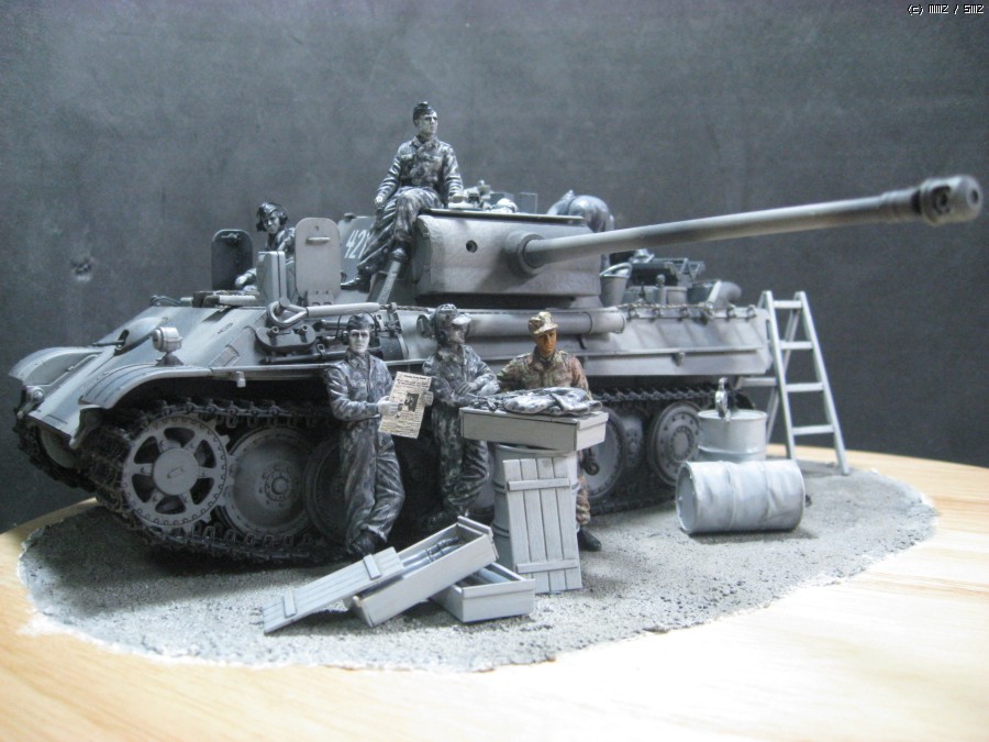 흑백사진 처럼 모두 흑과 백색으로만 조색한 셔먼을 만든 외국 모델러의 작품을 보고 독일군 삼색 위장으로 함 해보겠다는 생각을 무턱대고 시작 한넘입니다. 드래곤 판터G 스마트킷, 타미야의 마이바흐 엔진셑, 드래곤의 전차병세트, 아카의 장비품셑, 벨린덴의 의복세트등을 사용 했습니다. 그런데 여러가지로 어려운 경제여건이 편하게 작업을 하게 놔두질 않네요. 결국 처음 생각 한 많은 부분을 생략하고 현실과 적당히 타협을 하게 만드네요. 개인적으로 아직 미완성이라 생각 하지만. 감히 사진을 올립니다.