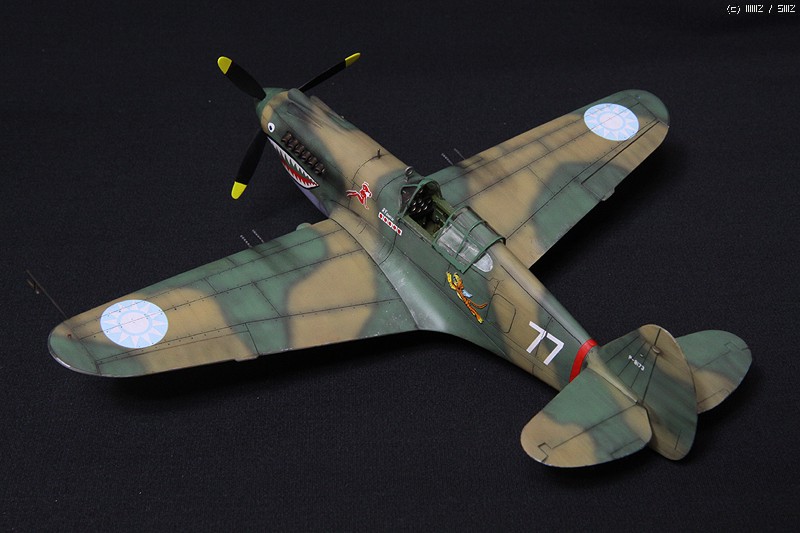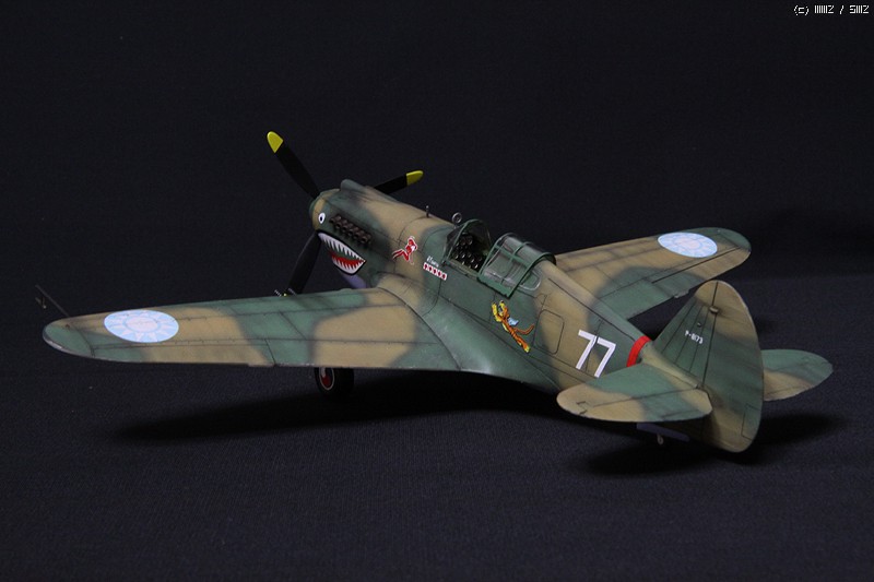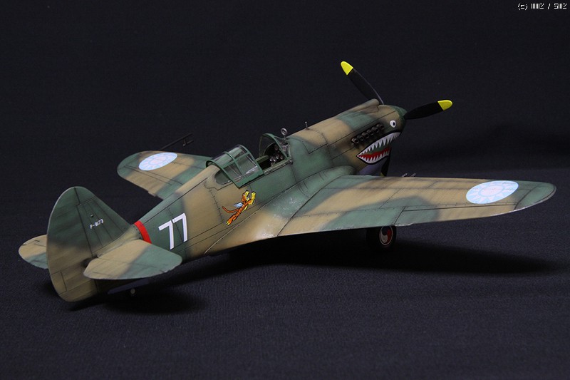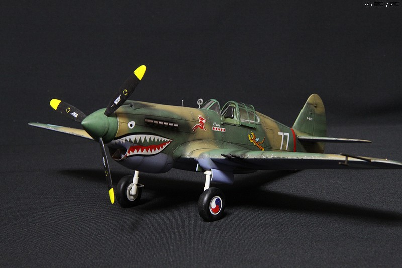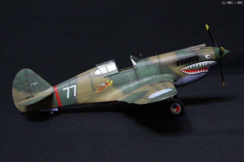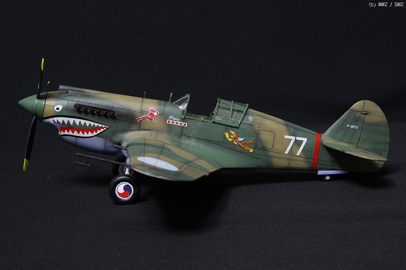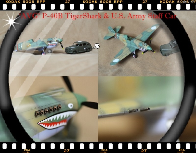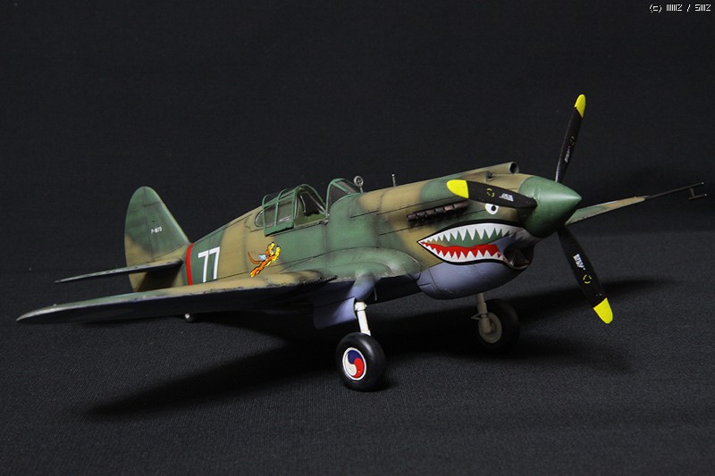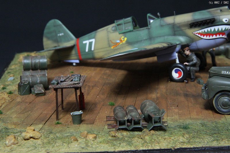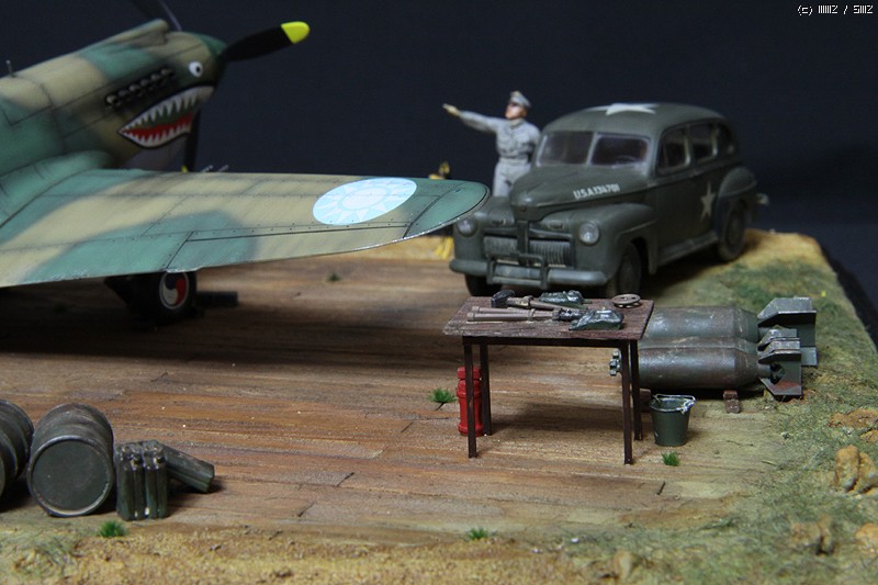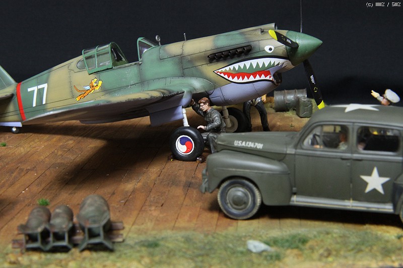 HobbyCraft 제품의 P-40B로 Chinese Air Force-Flying Tigers (American Volunteer Group; AVG)가 되겠습니다. AVG 리더인 Claire Chennault는 1941년 8월부터 훈련을 시작하였으며, 그해 12월 진주만 공습이후 일본 전투기에 비해서 P-40B는 내구성, 무장, 그리고 급강하에서 보다 빠른 장점을 이용하여 6개월에 걸쳐 일본군과 전투를 치뤘다고 합니다. 이 AVG는 1942년 미공군에 공식적으로 14비행대로 편재되었습니다. 그리고 차량은 타미야 제품의 1942년 포드에서 생산된 Staff car 입니다. 제작은 거의 스트레이트 조립으로 진행하였고, 콕핏의 사출좌석에 seat belt를 에칭으로 붙여주었고, 엔진 배기구와 총열을 핀바이스로 뚫어주었습니다.