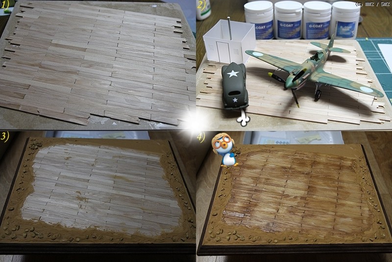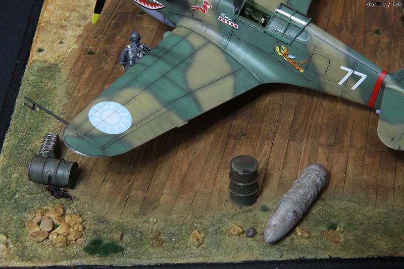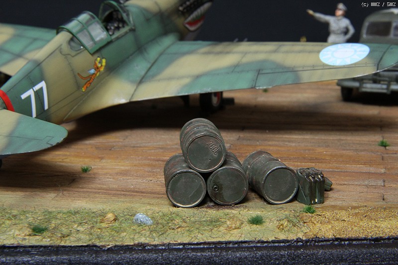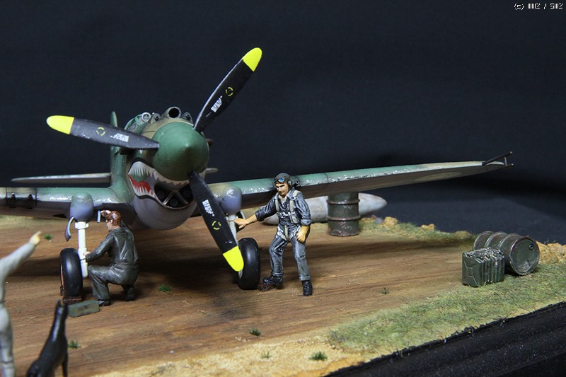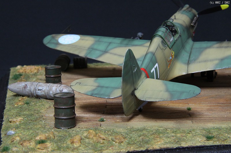 비행기는 락카 기본도색으로 위장도색은 프리핸드로 진행하였고, 기본적인 워싱작업을 했습니다. 웨더링은 당시의 상황에 맞게 디오라마로 꾸밀 것이어서 자제하는 쪽으로 했고, 다만 약간의 치핑과 기관포구에 따른 그을음 정도 표현했습니다.