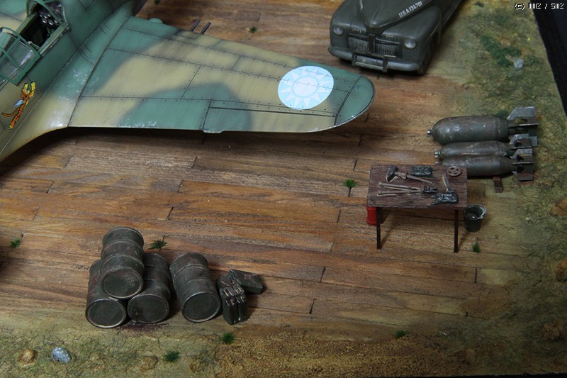 지상장비류 세트와 예전에 프롭기와 전차를 만들고 남은 각종 폭장류와 장구류등을 활용하였습니다. 테이블은 발사나무와 플라판으로 이용해서 자작하고, 테이블 판인 발사나무는 아크릴 burnt umber를 이용해서 채색하였습니다. 테이블 옆에 있는 물통에 황동선으로 손잡이 부분을 디테일업 해주었습니다.