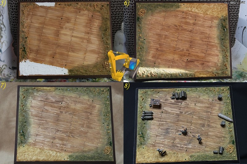 (8) 지상장비류 세트와 예전에 프롭기와 전차를 만들고 남은 각종 폭장류와 장구류등을 활용. 테이블은 발사나무와 플라판으로 이용해서 자작하고, 테이블 판인 발사나무는 아크릴 burnt umber를 이용해서 채색하였습니다. 테이블 옆에 있는 물통에 황동선으로 손잡이 부분을 디테일업. 인형들 위치시키고 한컷...