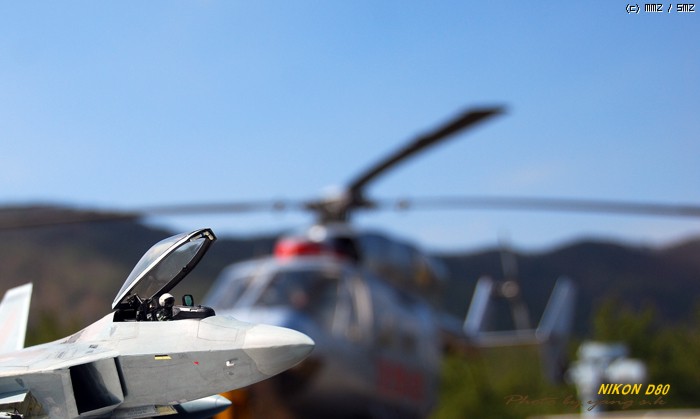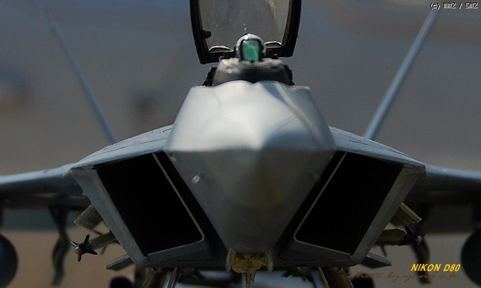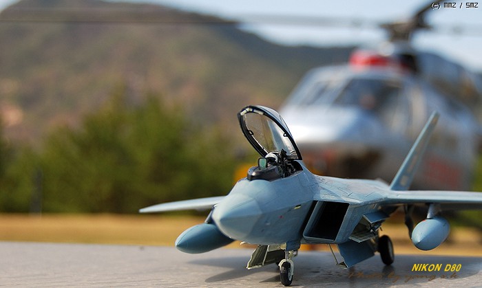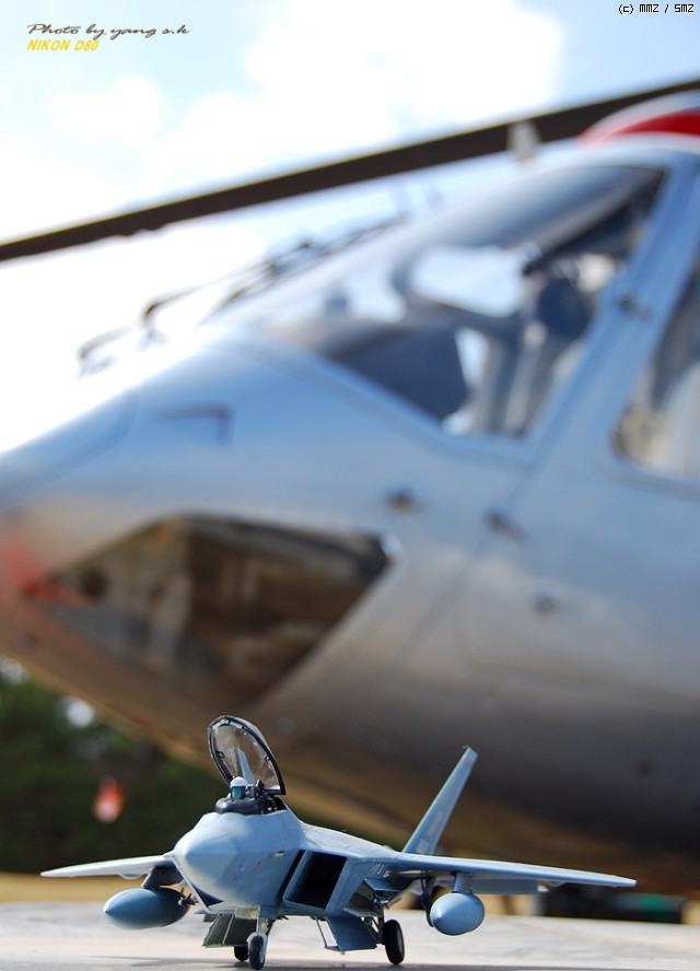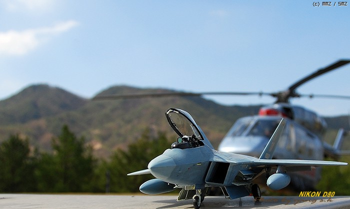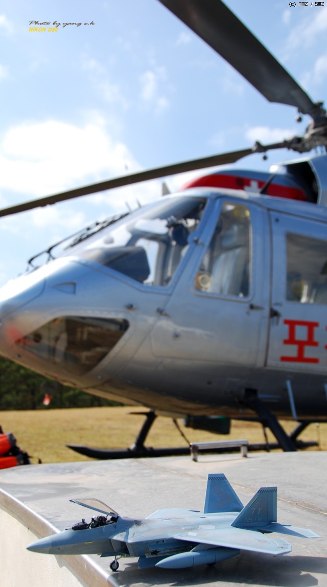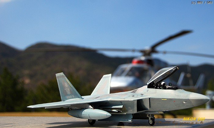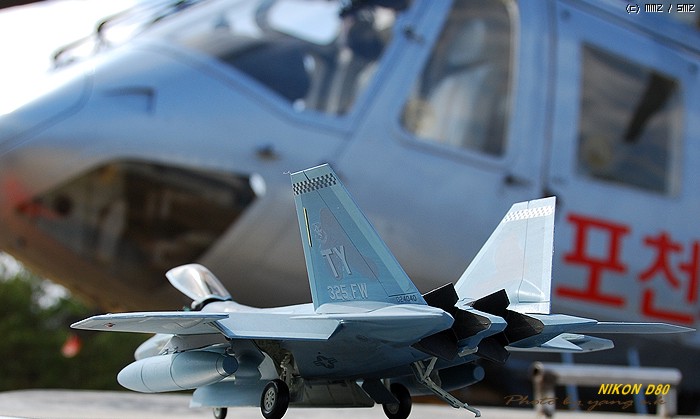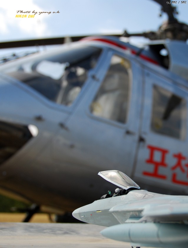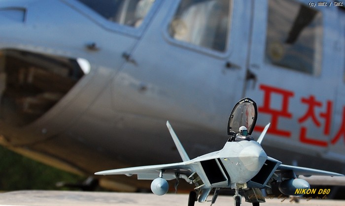 렙터는 다른 전투기에 비해 디자인이 단조로워 그다지 끌리지 않았는데, 막상 완성해 놓고 보니 생각외로 끌리게 되더군요. 제가 거주하는 곳이 한수이북인지라(군사지역) 이녀석 완성하면 인근 비행대(부대), 종합사격장 등지에서 사진촬영하고 싶었는데(부대촬영은 법으로 금지되어 있기에 절대로 촬영하면 안됩니다. 저의 소망이 그렇다는 것입니다..ㅎㅎ) 우연찮게 동네인근에 시청소속의 헬기장이 있어 촬영부탁을 하니 흔쾌히 승락해 주시더군요. 참고로 조종사 아저씨가 월간항공(월간지)이 회사라 하시더군요.이래저래 눈치도 보이고 마땅히 놓고 찍을 만한 곳이 없어 기체의 다양한 앵글이 많이 부족합니다. 거의 모든 작품들이 제품촬영으로 이루어지고 있는것을 볼때, 좀 실증을 느끼던 차에 야외촬영을 하게 되었는데 반응이 좋은 것 같습니다...아마도 저처럼 똑같은 제품에 똑같은 촬영에 염증을 느끼시는 분들이 많으셔서 그런지 모르겠지만 앞으로 쭈~욱 야외촬영을 해 보렵니다. [도색:아카데미 에나멜 붓도색]