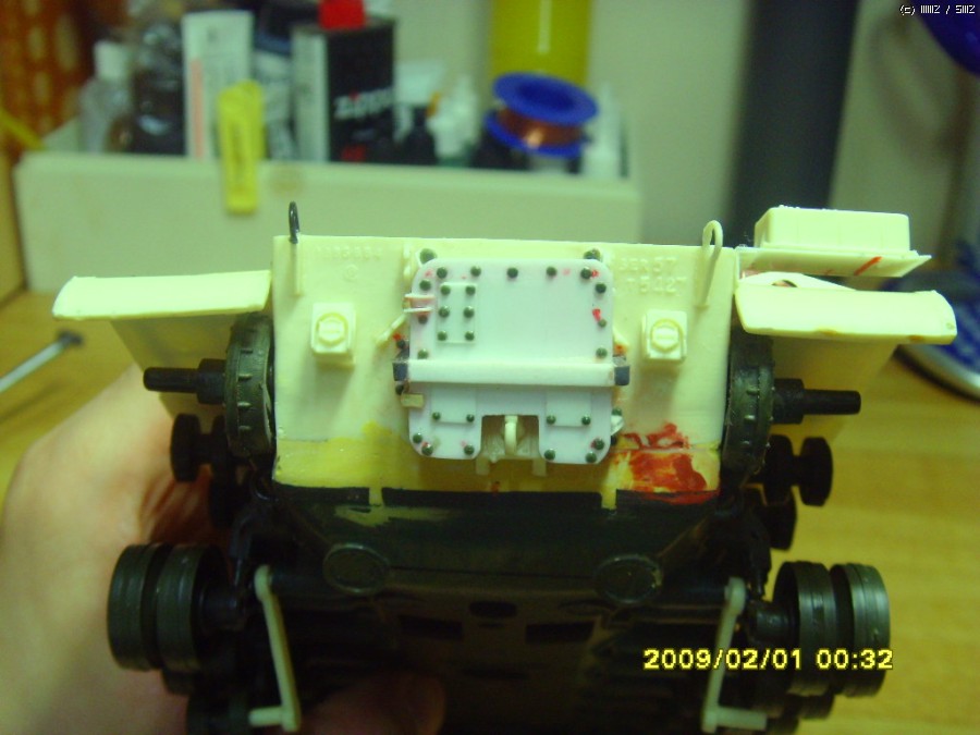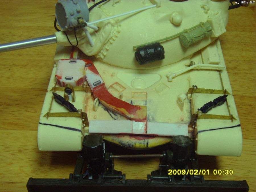 솔직히 이부분은 좀 잘못 만들었습니다. 동력파이프로 보이는 부분은 약간 더 가늘고 좀더 간격이 있어 보이는데 M48의 둥근 차체에 직선의 프라판을 이용해서 만들자니 너무 힘든 작업이었습니다. 결국 대충 기분 내는 선에서 마무리 하였습니다.