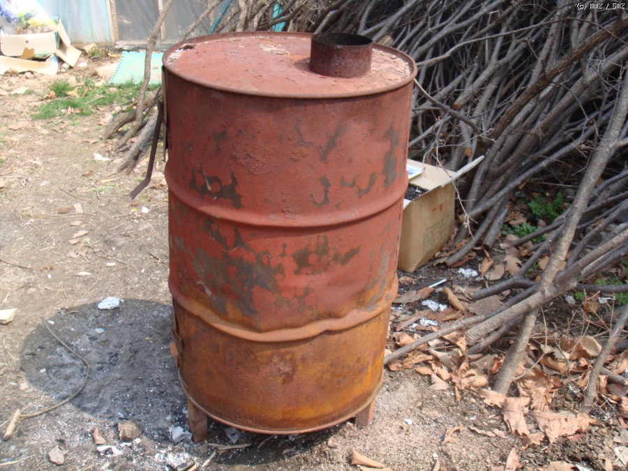 이건 제가 매달 가는 목공방에 있는 녹슨 드럼통입니다. 이 드럼통을 관찰해서 느낀 점을 배기구 표현에 많이 참고했습니다.