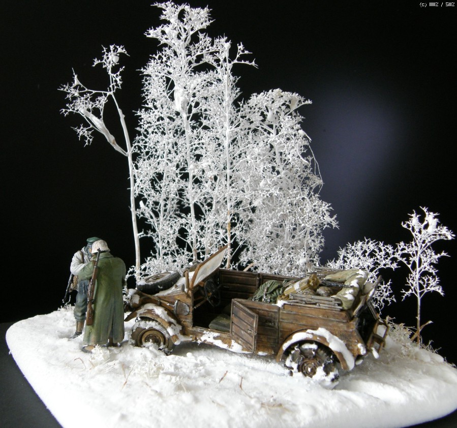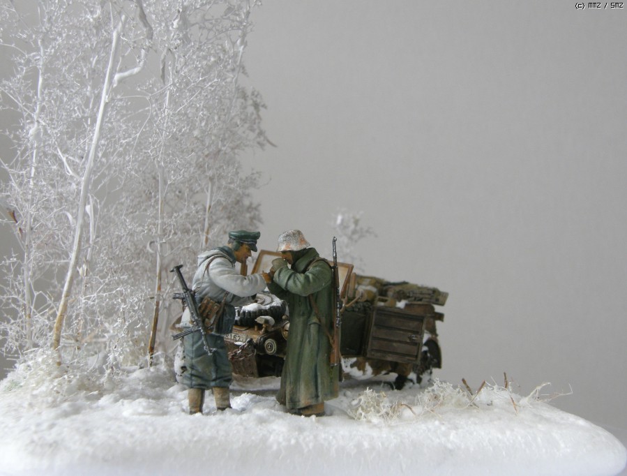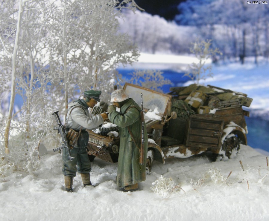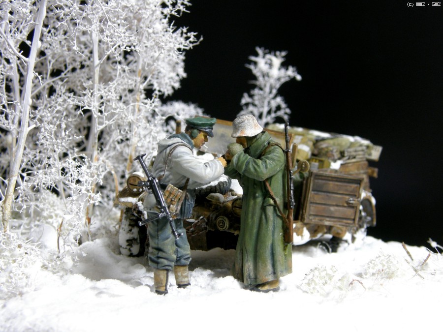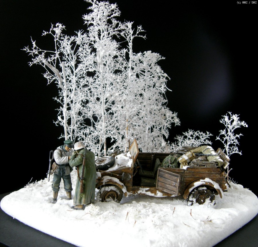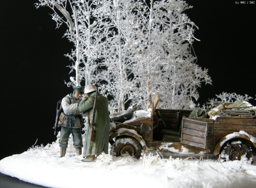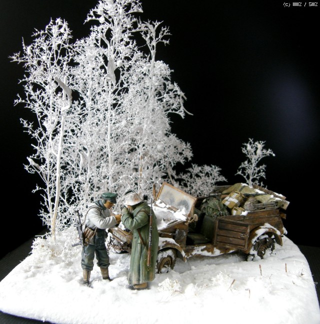 담배를 나누어 피우는 두병사의 동계 위장복과 군복을 입은 모습이 멋져보여서 눈덮인 들판일부를 연상하여 퀘벨바겐과 병사를 이용 하여 잠간 휴식을 취하는 장면을 연출 해 보았습니다. 초여름에 왠 눈밭 이냐고 생각 하시 곘지만 ....... 그냥 편하게 봐 주십시요 감사 합니다.