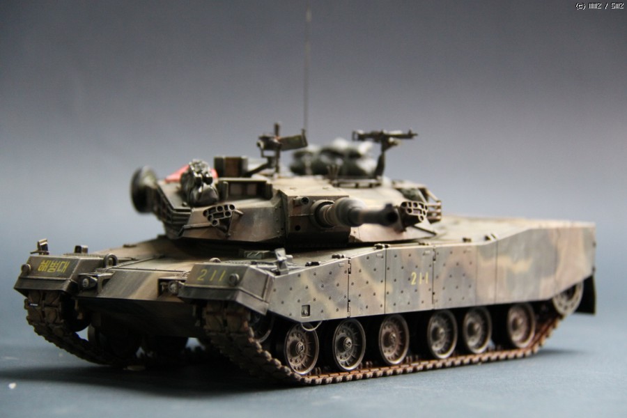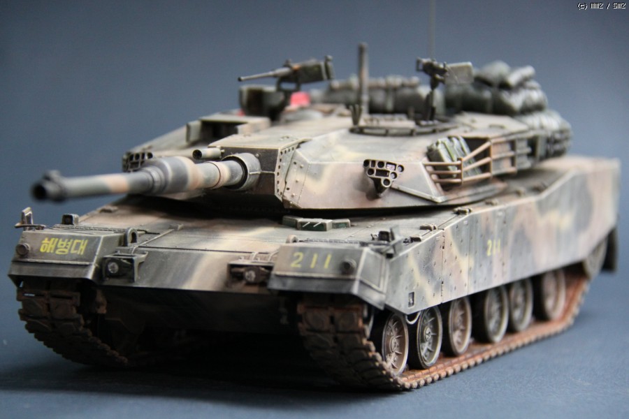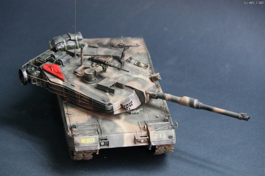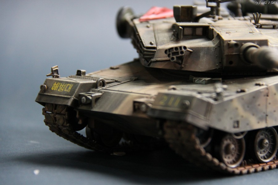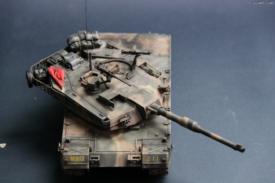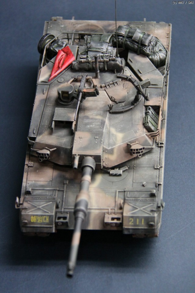 K1A1 해병대 버전 입니다. 아직까지도 해병대에는 K1만 배치된 상태라..미래의 컨셉 되겠습니다. 많이들 깃발로 사용하시는 부품은 대공 식별용으로 사용하였습니다. 글씨및 숫자는 손으로 그린거라서..다소 삐뚜루~합니다^^ 설정은... "양포 종합 기동사격장" 인데, 사격컨셉치고는 장비품이 다소 많은듯 합니다. 위장무늬는 에어브러시 작업이며 해병대 K1은 육군과 달리 포탑과 차체 상부에도 TAN 색의 띠가 들어갑니다..