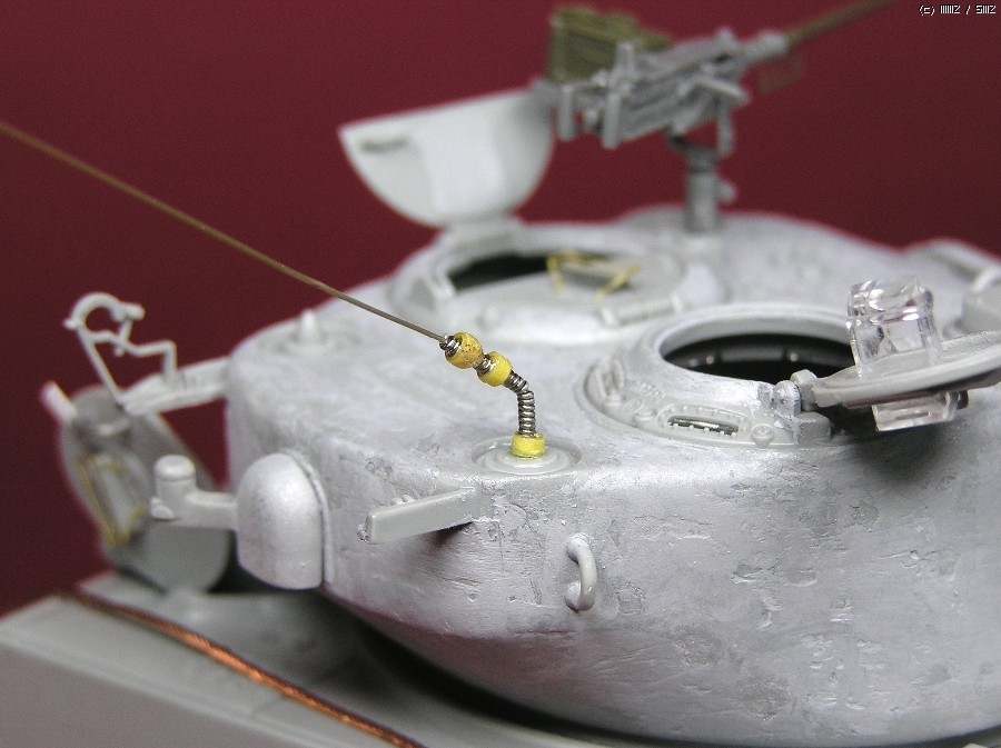 안테나 지지대는 키트에 부품이 없어서 모양을 보고 수지침과 마스킹테입으로 만들어주었습니다. 셔먼의 포탑위에서는 빠져서는 안될 중요 부품인데 말이죠-_-;;