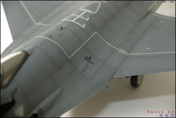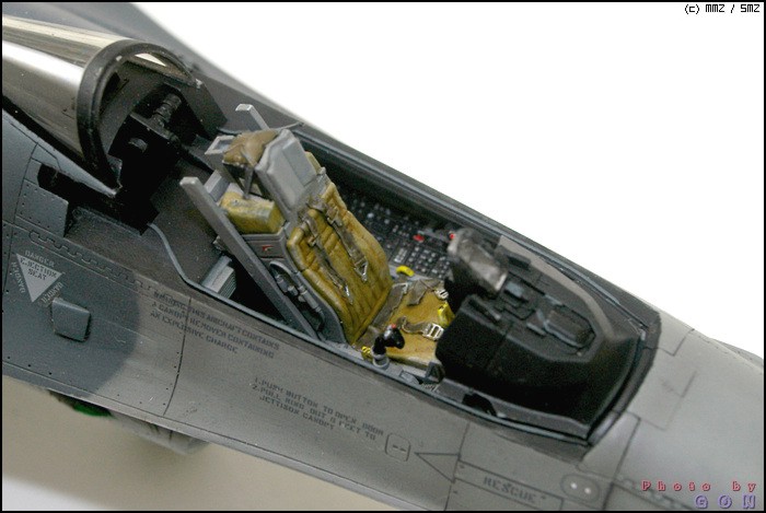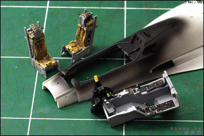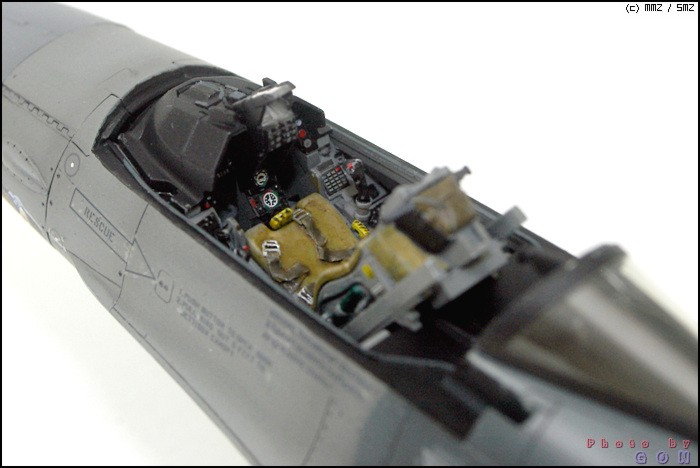▷ 조명을 잘못넣어줘서 MFD가 안나왔군요..ㅠㅠ 여튼 MFD는 데칼로 처리하게 되어있고, 봐줄만 합니다. 다리 사이에 아주 잘보이는 계기는 다른 킷에 있는 데칼을 잘라 붙여주었습니다.