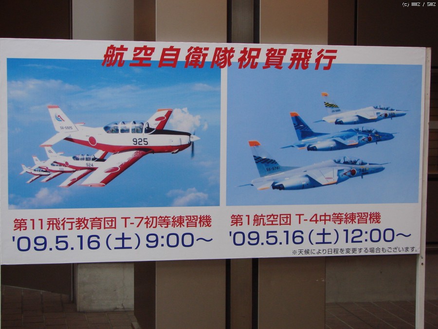 항공자위대의 축하비행 안내문. 그런데 비 때문에 낮의 T-4 비행은 취소됐습니다.