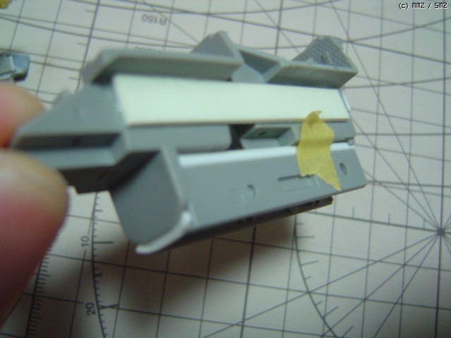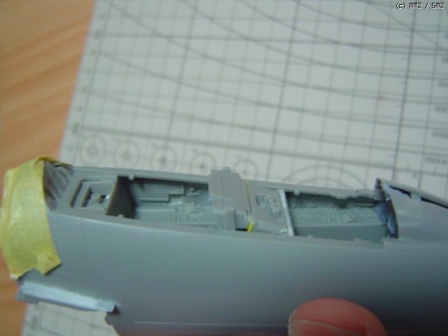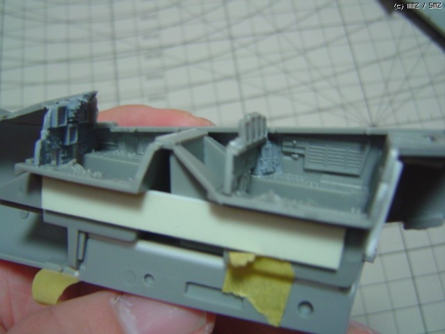 너무 갈아낸 탓에 조종석과의 접착 위치를 잡기가 힘들어져서 다시 프라판을 덧붙여야 했습니다.(흰색 프라판이 보이시나요?)