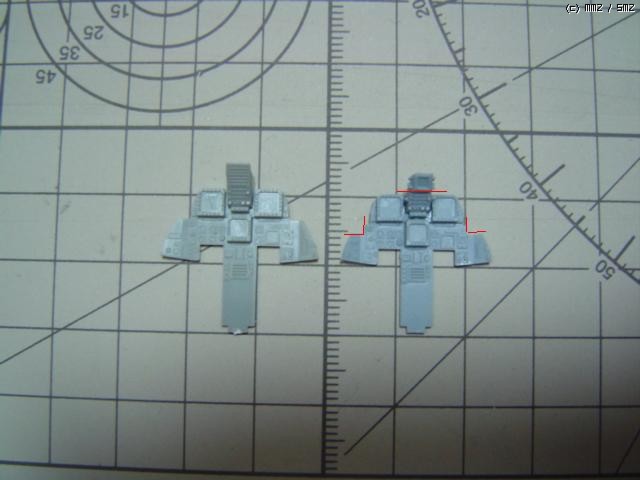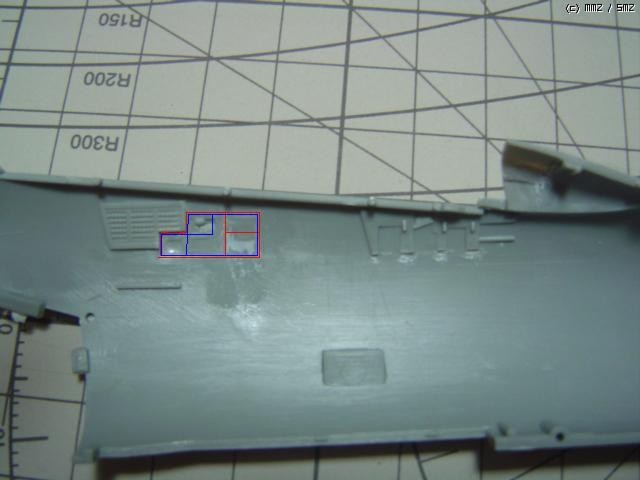 사진에 그어진 선 중 파란선은 디테일 수정을 위해 원래의 키트상태에서 칼을 여러번 그어서 잘라낸 자리를 나타냅니다.