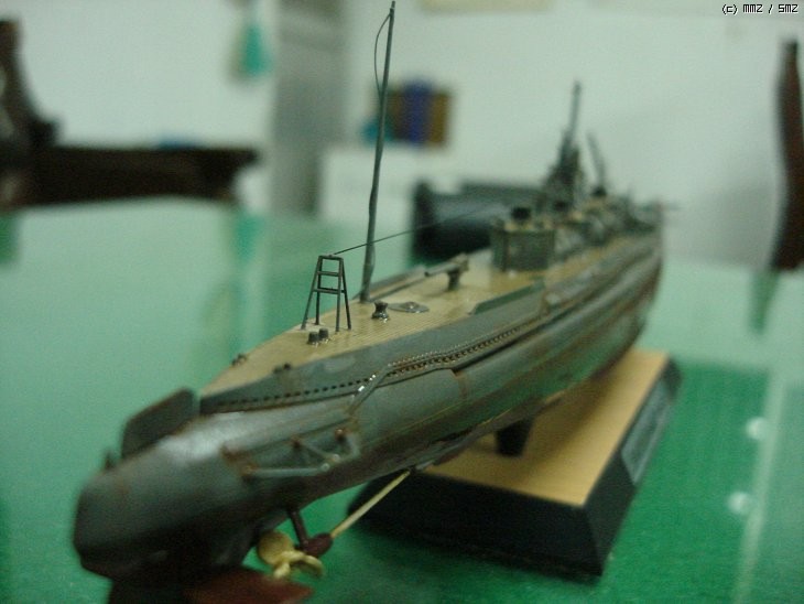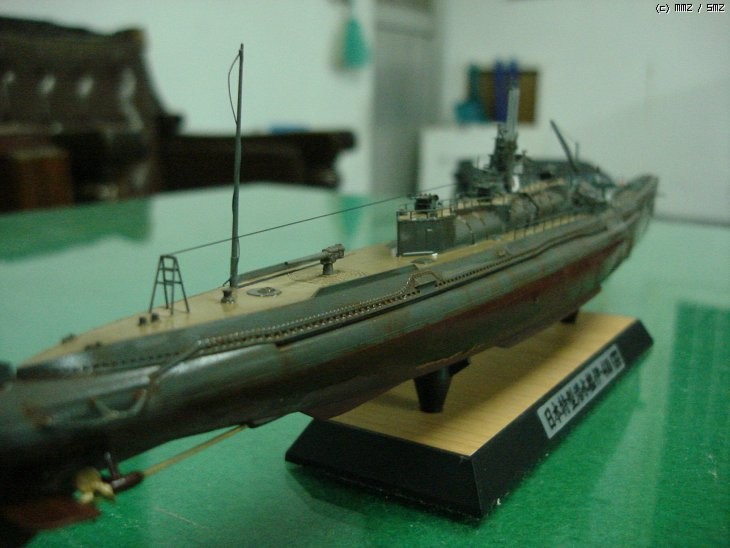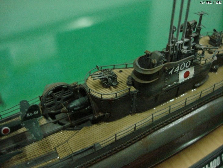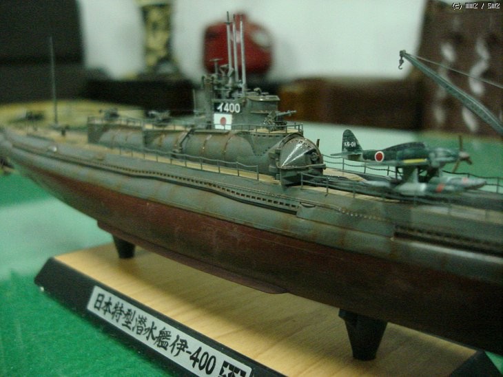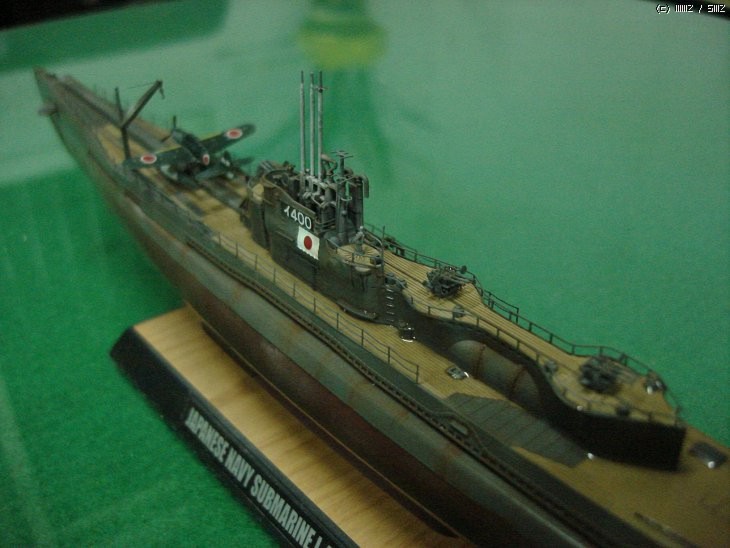 타미야 1/350 일본 대형항공잠수함 I-400 센토쿠입니다. 수면으로 부상후 함재기인 특수공격기 사이렌을 발진시키려는 모습으로 한척 만들어 본겁니다. 뭐 발진시키려면 회수용크레인은 누워있어야 정상인데..작업한 에칭이 아까워서 그냥 세워봤습니다. 전용에칭이 나오기전 발매시에 구입했던거라 그냥 1/350 라이온 함선용 에칭에서 난간이랑 이것저것 뜯어다 붙여서 작업했던겁니다..^^. 함체에 물표현을 위해 미디움겔을 좀 발라줬는데.그럭저럭 괜찮은 것 같네요.