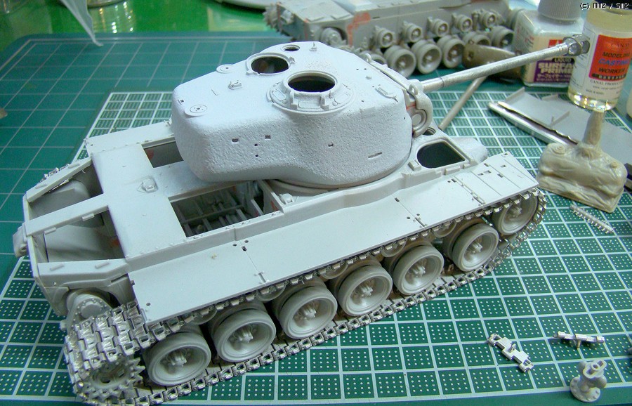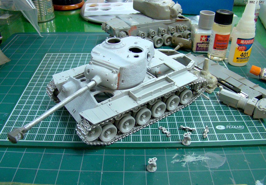 포탑 측면 부분이 수축이 먹어서 전체적으로 퍼싱다운 모습이 약해서, 에폭시 및 퍼티로