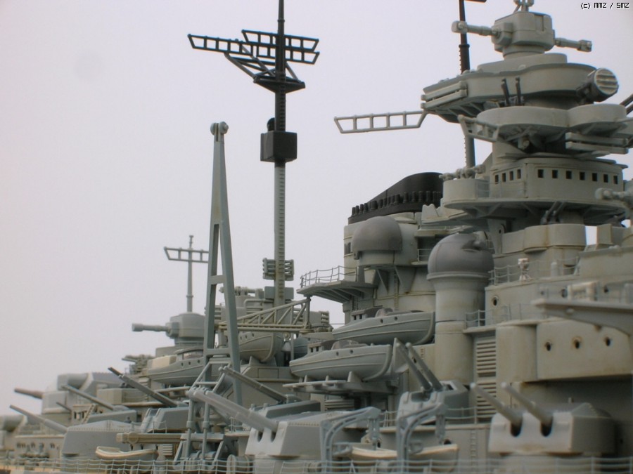 작업중인 1/350 레벨 비스마르크입니다. 아직 세부 마무리가 좀 덜 되었습니다만 대강 큰 덩어리들은 조립과 도색이 끝나 마감재 뿌리기 전 워싱 톤 조절 테스트도 겸해 간단히 사진좀 찍어 봤습니다. 눈으로 봐선 괜찮겠다 싶은 웨더링도 이렇게 카메라의 객관적인 눈으로 보면 다소 과한 부분이 눈에 잘 띄거든요...^^;;