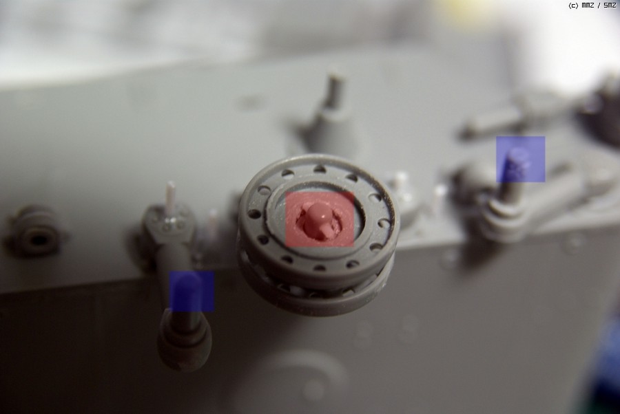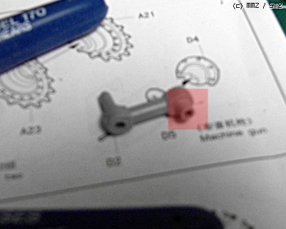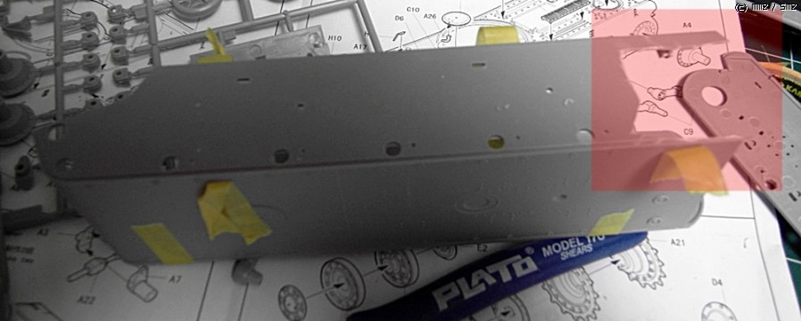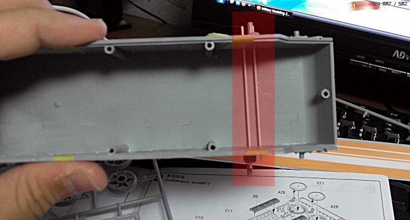 확대한 사진인데요.. (똑딱이로는 한개가 있더군요. -_-; 별수 없이 GX-10 출동..) 끝단에 타공을 해서 프라봉을 가로질러 넣은 다음 무수지 접착제 같은 것으로 고정 합니다. KV 시리즈의 경우 저 위에 다시 덥개를 씌우도록 되어 있기 때문에 깔끔하게 처리가 가능합니다. 마찬가지로 다른 서스펜션도 동일한 위치(사진상의 파란 부분)를 타공하고 프라봉을 끼워 줍니다.