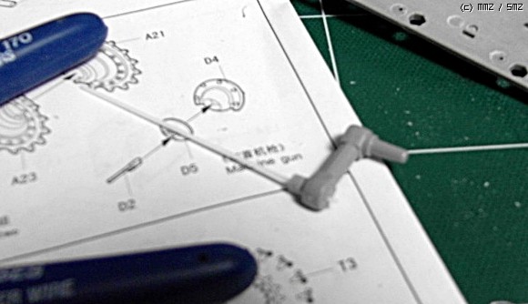 트럼페터 KV 시리즈의 경우 고정식 모델이기 때문에 구동륜을 접착 하도록 되어 있습니다. 이를 가동식 처럼 바퀴가 부드럽게 돌아가기 위한 꽁수라고나 할까요? ^^; 사진 상의 빨간 부분과 같이 서스펜션의 끝단에 1mm로 타공한 뒤 휠을 집어넣고 1mm 프라봉을 타공한 부분에 가로질러 넣습니다.