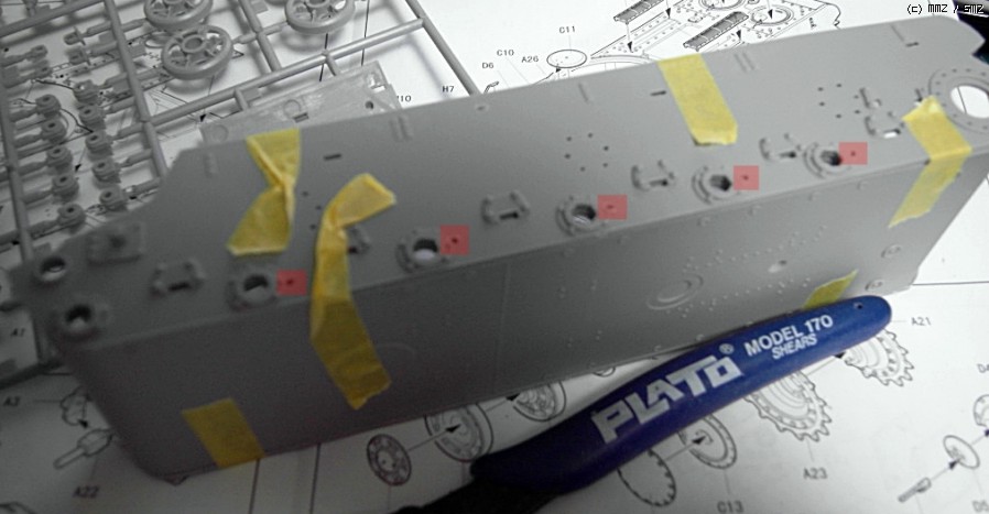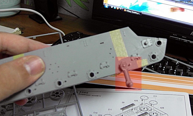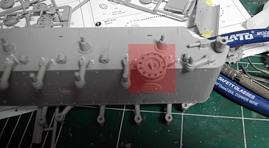 가동식 서스펜션 개조예 입니다. 트럼페터 KV 시리즈의 경우 서스펜션과 몸체가 붙는 부분이 육각으로 되어 있는데 사포로 깨끗이 밀면 자유롭게 움직이게 만들 수 있습니다. (빨간색 부분)