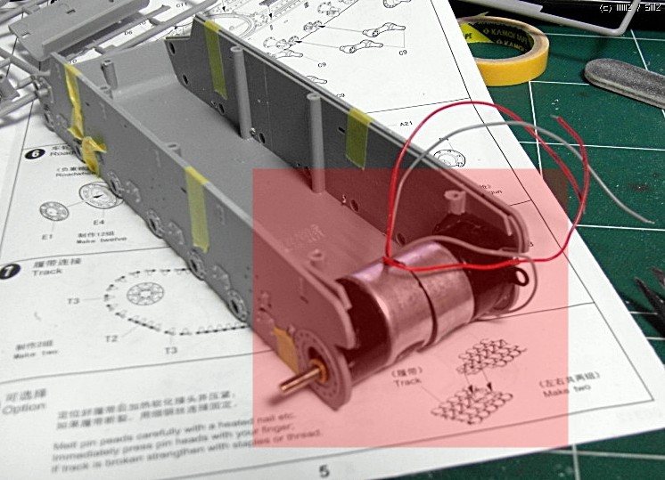 모터를 연결합니다. (사진의 빨간부분) KV 시리즈의 경우 거의 딱 맞게 마이크로 DC 기어드 모터가 들어가더군요. M1A1의 경우 넉넉한 편 입니다.