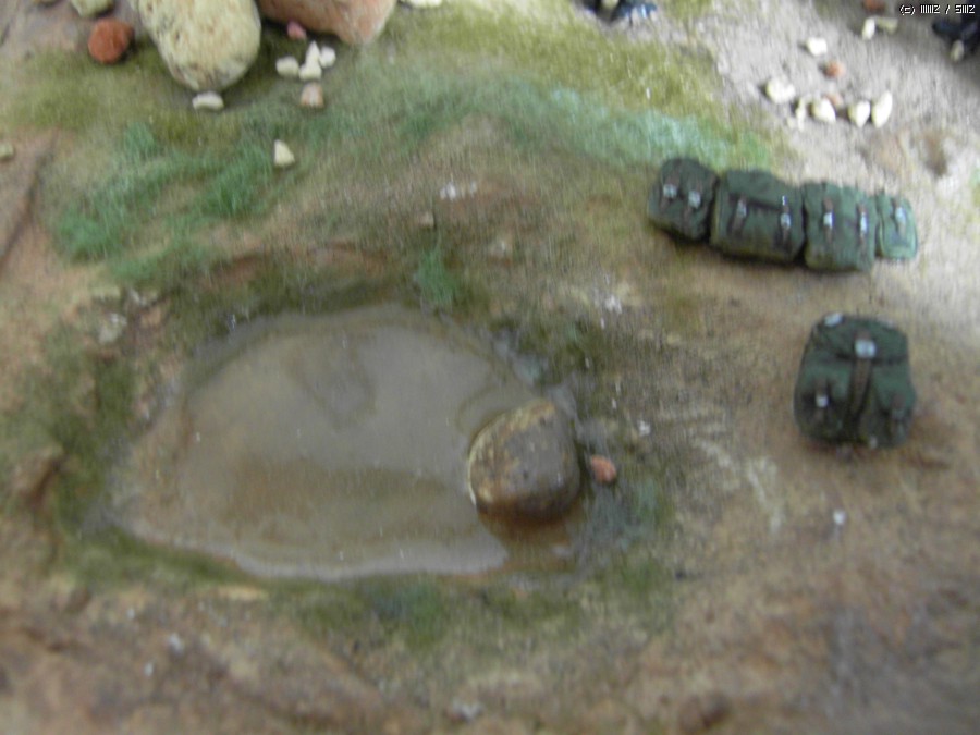 웅덩이를 만들어보았습니다.... 흙탕물처럼 보이게하려고 약간 탁하게 만들어보았습니다...옆에는 배낭들....