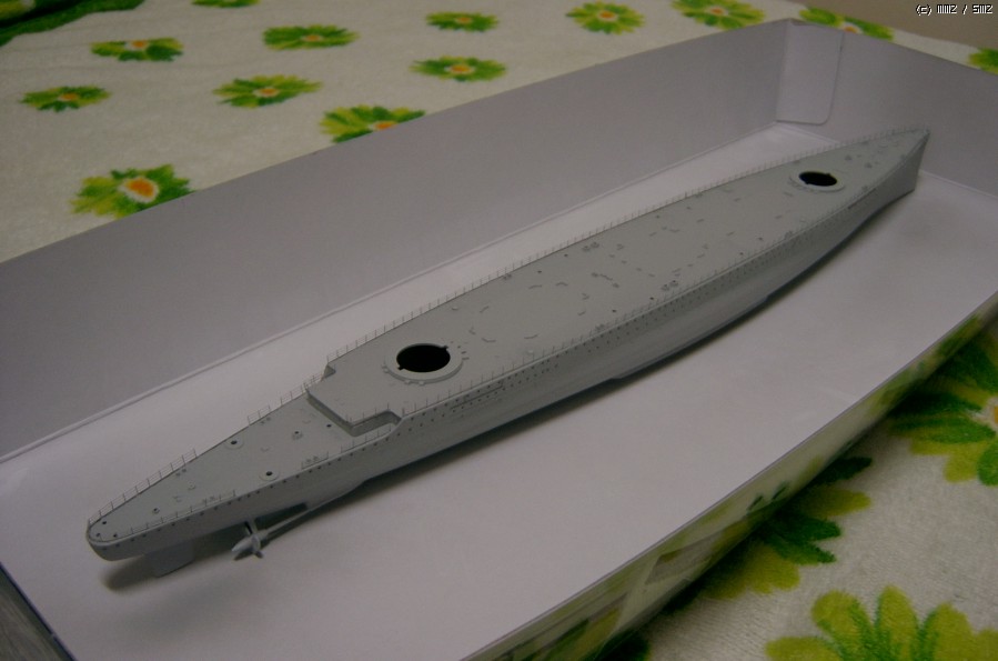 전에 함선모형란에서 썼듯 원래 헐에 있는 턱을 0.3mm 높이고 갑판과 헐 사이에 틈을 약간 벌려둔 상태인데, 목적은 난간을 미리 헐에 붙인 상태에서 색칠에 들어가려는 겁니다. 그래서 오늘 난간을 붙이고 서페이서를 입혀 뒀습니다. 이제 기본색 칠해야죠. 타미야 서페이서 라이트그레이가 어찌된 영문인지 색감이 무지 좋아서, 저 상태에서 시험삼아 목갑판 올려 보니 조명 상태에 따라선 도색완료된 것처럼 보이기도 하더군요. -_-;;;