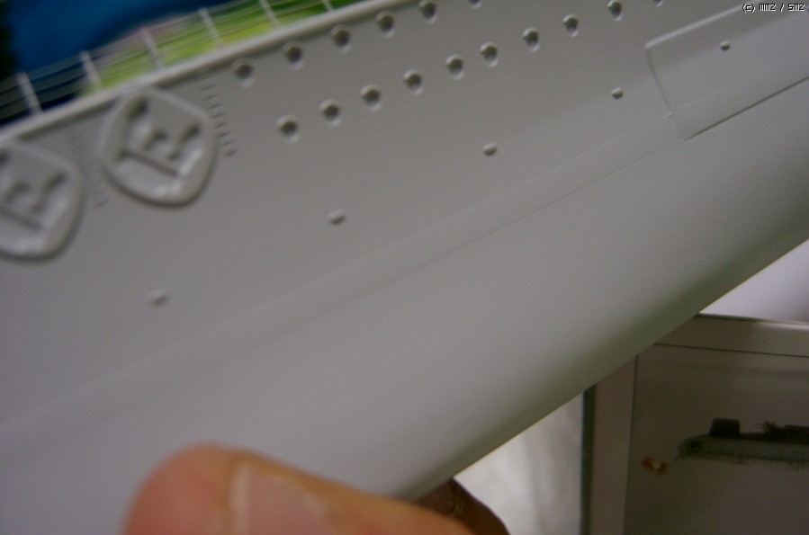 그리고 원래 플러스몰드 선 두 개로 묘사되는 부분이 더 짙어 보일 텐데, 저건 일종의 삽질의 결과물입니다. -_-; 원래 저 부분은 실함에도 단차가 있는 것처럼 보이는 사진이 있기 때문에, 플러스몰드 두 개 사이를 서페이서로 채워버린 거죠. 아래쪽에 사포질 된 부분이 있는 이유도 바로 그 부분을 밀면서 함께 밀린 겁니다. (즉 위에서 말한 사포질 유무의 차이 확인은 처음부터 의도한 게 아니라 나중에 생각난 김에 서페이서를 확 두텁게 입혀버린 겁니다.)