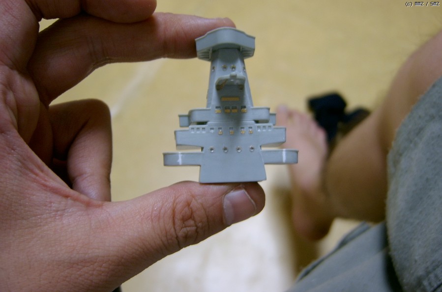 한참 에칭작업 중인 함교탑. 제일 하단의 윙브릿지에 희게 스페이서가 박힌 부분이 보일듯. 함교탑 최대의 설계미스입니다. 0.5mm정도 비는데, 이 정도로 빈틈 비는 경우는 꽤 오랜만에 봅니다. 뭐 어려운 작업은 아니니 상관없겠죠...