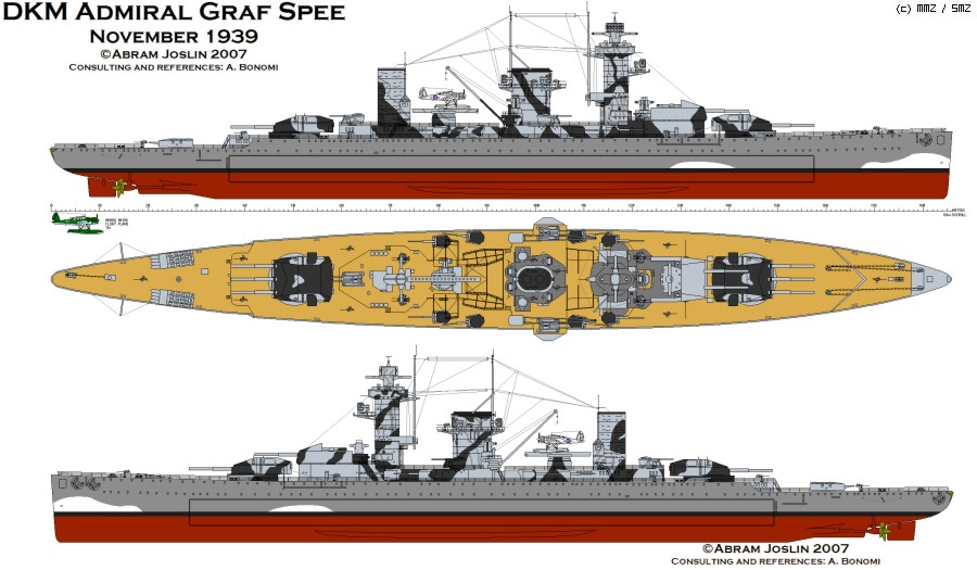 이 위장전함 형태는 1939년 11월, 그라프 슈페가 인도양과 남대서양에서 통상파괴전에 종사할 당시 영국해군의 추적을 뿌리치기 위해 영국식 위장미채를 그리고 가짜 포탑과 연돌까지 달아 영국 중순양함으로 일시적으로 위장한 형태입니다.