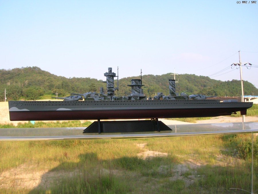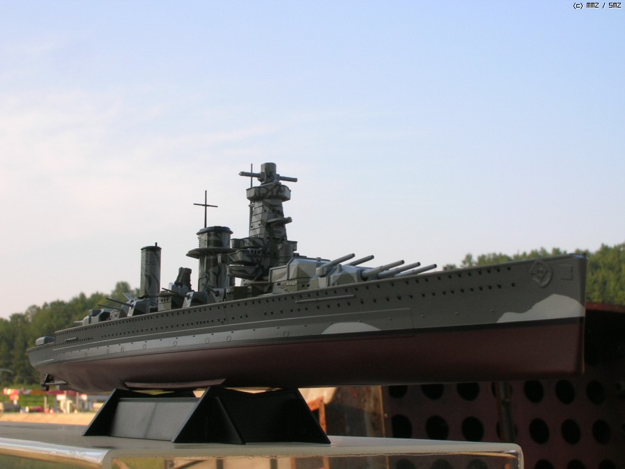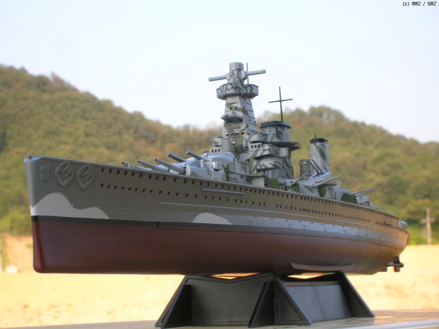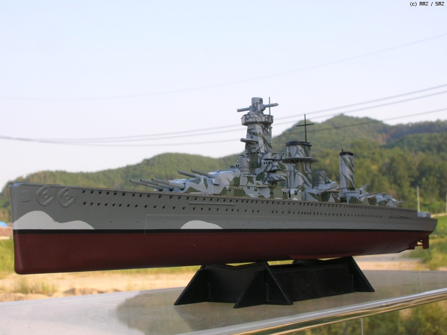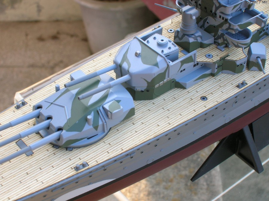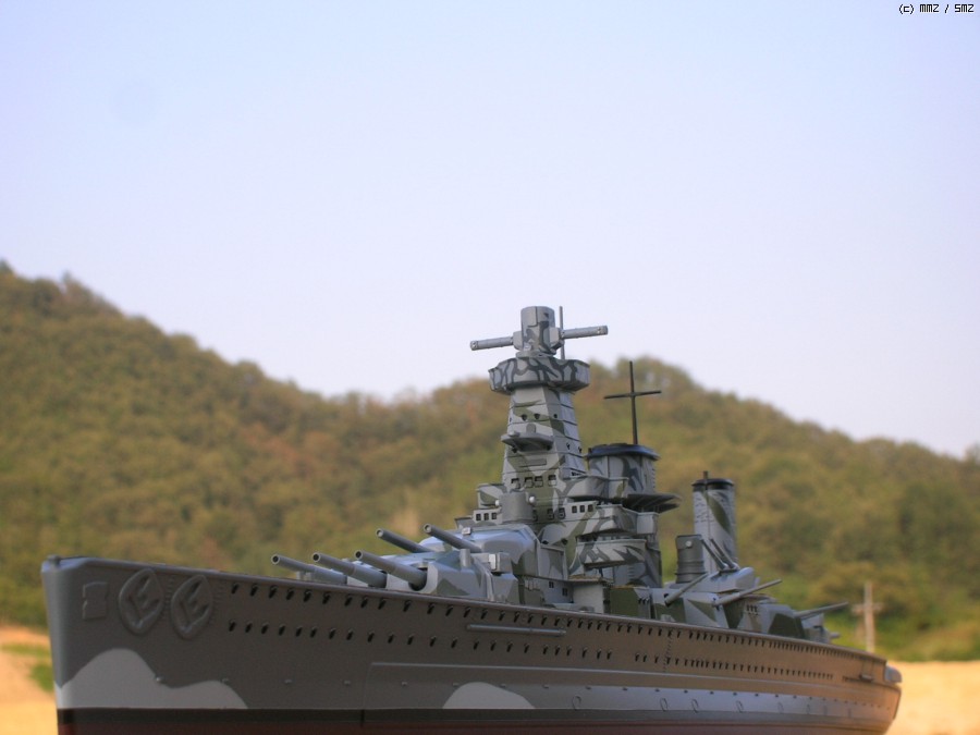이 라인드로잉의 출처는 Kbismarck.com이며 도면상에서는 함교 상부의 미채가 거의 블랙에 가까운 다크그레이와(큰 위장미채) 오션그레이(연돌과 함교 상단의 작고 가는 위장미채)의 투톤이지만 일반적으로는 저 큰 위장미채 부분이 다크그린으로 칠해졌다고 알려져 있기 때문에 전 다크그린쪽을 채용해 칠했습니다.