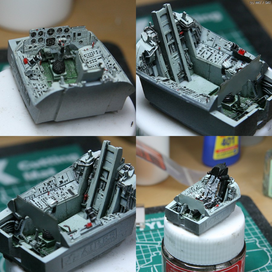 콕핏 도색은 언제나 재미있습니다. 전방 계기판은 도색후에 필름을 뒤에다 덧붙여주면 됩니다. 콕핏의 기본도색은 에어브러쉬 작업으로 검정색으로 미리 살짝 뿌려준 뒤에 락카 117번으로 칠했습니다. 이후 붓질로 유화 워싱하고, 에나멜 검정으로 먹선을 넣어준 뒤에 버튼류들을 에나멜 검정과 빨강으로 세필붓으로 찍듯이 칠해주었습니다. 시트 레일부분의 배선류들은 은색 에나멜로 붓질 도색해 주었습니다.