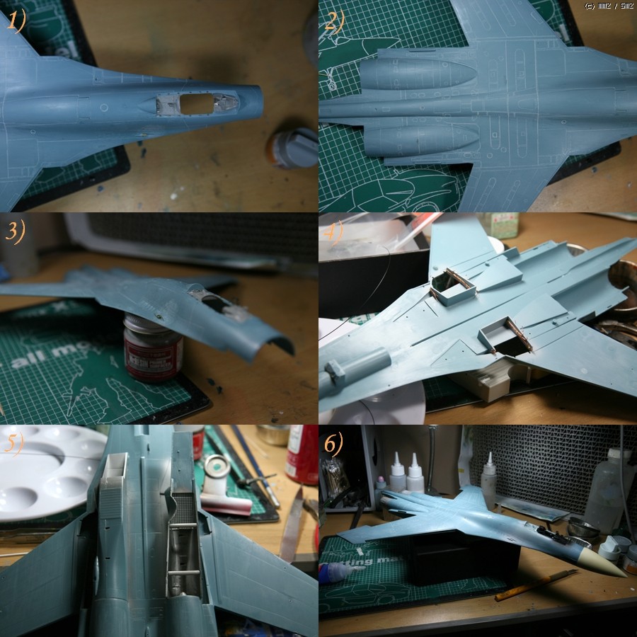 3-4) 열심히 물사포질을 한 결과입니다. 그리고 없어진 패널라인과 점검창을 다시 긋어주었습니다. 트럼페터 킷을 보면 앞부분의 패널라인과 아카데미 킷과 차이를 보여줍니다. 저야 고증은 그다지 따지지않고 만드니 아카데미 킷에서 없어진 라인을 잡아주는 것으로 작업을 끝냈지만, 나중에 확인된 바 라인이 약간 뒤로 밀렸네요^^.. 킷의 접착을 순접으로 해서 (4)의 옆라인이 접합선 수정이 안된 것처럼 떠 보입니다..